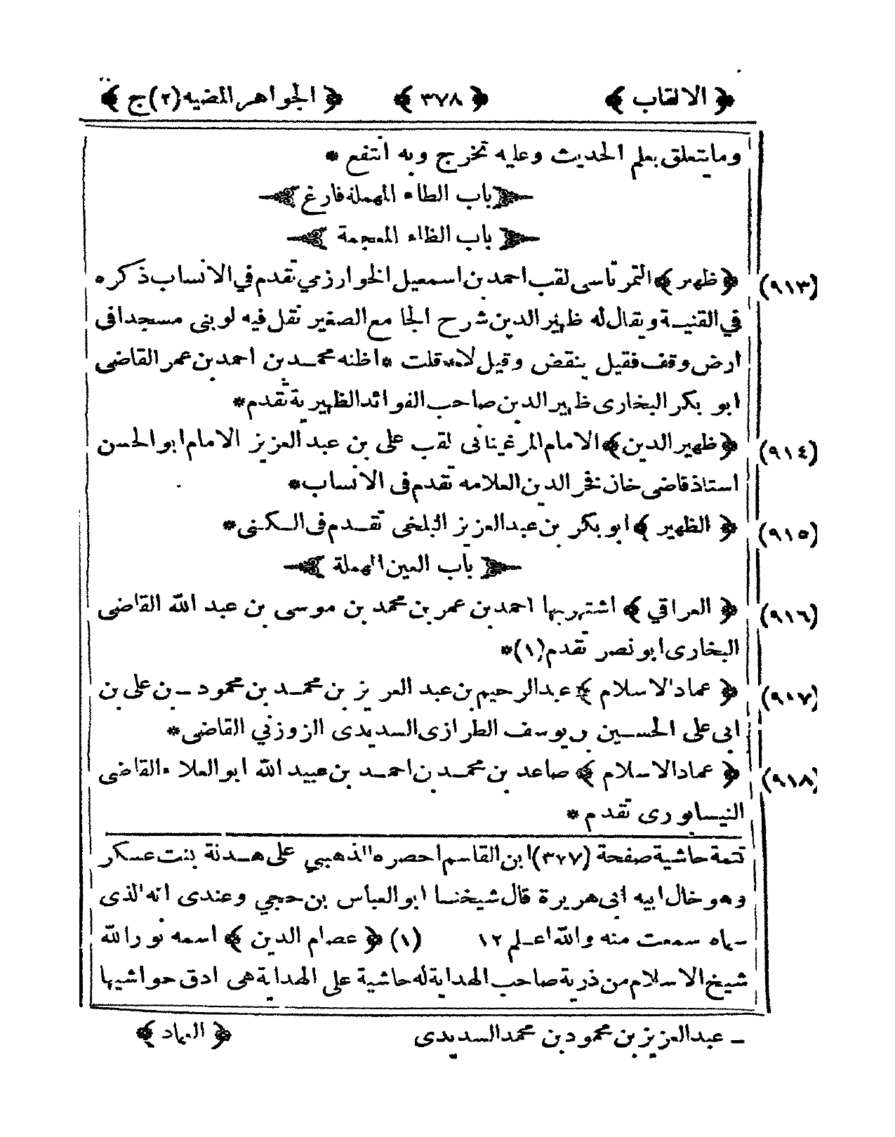 914 - ظهير الدّين الإِمَام المرغيناني لقب عَليّ بن عبد الْعَزِيز الإِمَام أَبُو الْحسن أستاذ قَاضِي خَان فَخر الدّين الْعَلامَة تقدم فى الْأَنْسَاب