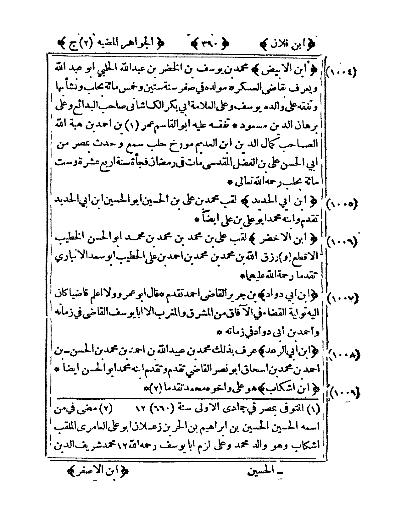 1004 - ابْن الْأَبْيَض مُحَمَّد بن يُوسُف بن الْخضر بن عبد الله الْحلَبِي أَبُو عبد الله وَيعرف بقاضي الْعَسْكَر مولده فى صفر سنة سِتِّينَ وَخمْس مائَة بحلب وَنَشَأ بهَا وتفقه على وَالِده يُوسُف وعَلى الْعَلامَة أبي بكر الكاشاني صَاحب الْبَدَائِع وعَلى برهَان الدّين مَسْعُود تفقه عَلَيْهِ أَبُو الْقَاسِم عمر بن أَحْمد بن هبة الله الصاحب كَمَال الدّين ابْن العديم مؤرخ حلب سمع وَحدث بِمصْر من أبي الْحسن عَليّ بن الْفضل الْمَقْدِسِي مَاتَ فى رَمَضَان فَجْأَة سنة أَربع عشرَة وست مائَة بحلب رَحمَه الله تَعَالَى