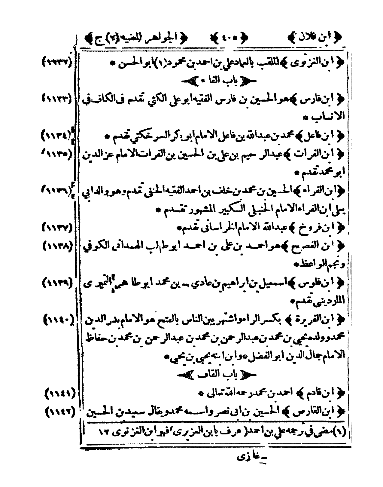1140 - ابْن الفريرة بِكَسْر الرَّاء واشتهر بَين النَّاس بِالْفَتْح هُوَ الإِمَام بدر الدّين مُحَمَّد وَلَده يحيى بن مُحَمَّد بن عبد الرَّحْمَن بن مُحَمَّد بن عبد الرَّحْمَن بن مُحَمَّد بن حفاظ الإِمَام جمال الدّين أَبُو الْفضل وَابْن ابْنه يحيى بن يحيى