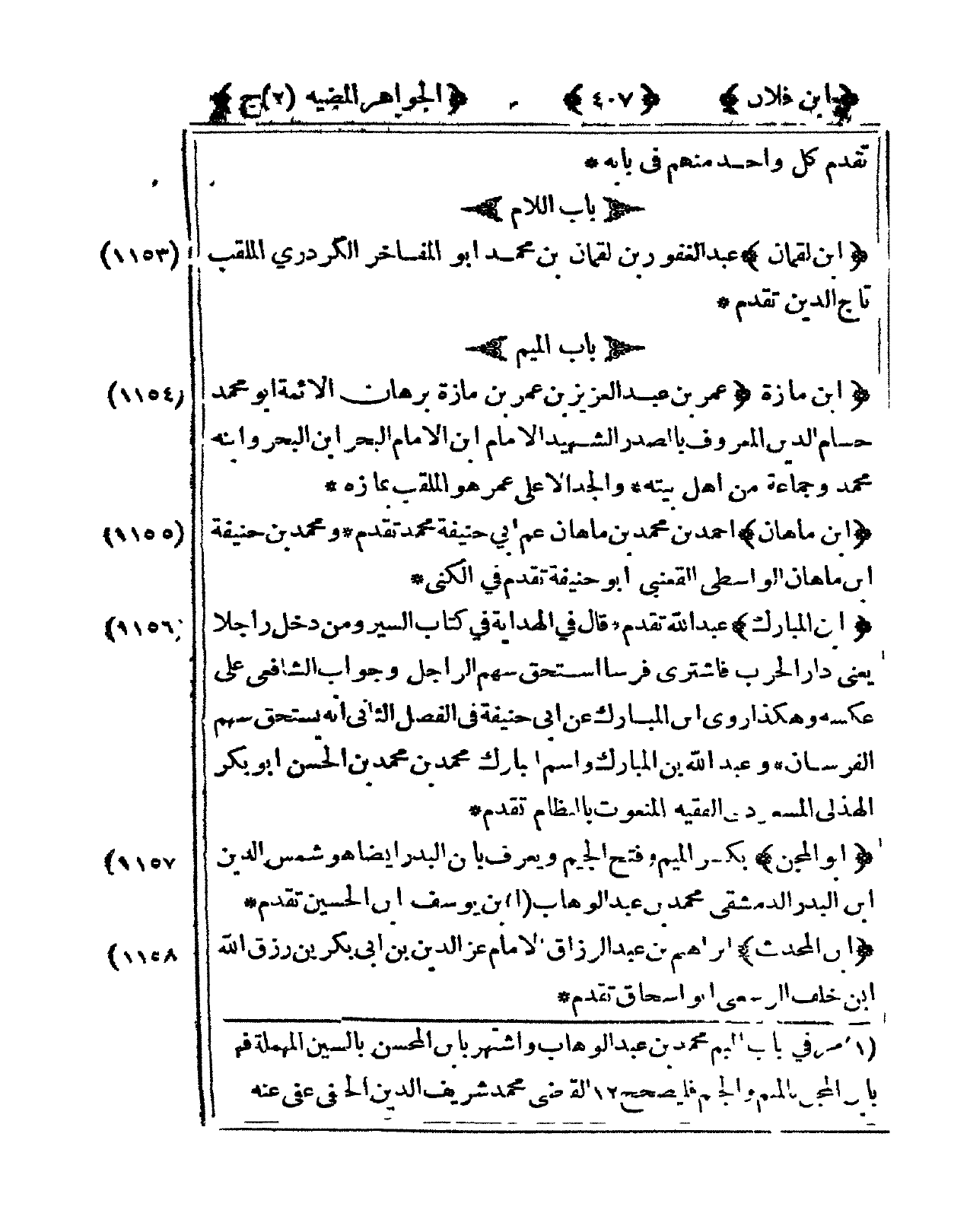 1156 - ابْن الْمُبَارك عبد الله تقدم قَالَ فى الْهِدَايَة فى كتاب السّير وَمن دخل رَاجِلا يَعْنِي دَار الْحَرْب فَاشْترى فرسا اسْتحق سهم الراجل وَجَوَاب الشَّافِعِي على عَكسه وَهَكَذَا روى ابْن الْمُبَارك عَن أبي حنيفَة فى الْفَصْل الثَّانِي أَنه يسْتَحق سهم الفرسان وَعبد الله بن الْمُبَارك وَاسم الْمُبَارك مُحَمَّد بن مُحَمَّد بن الْحسن أَبُو بكر الْهُذلِيّ المَسْعُودِيّ الْفَقِيه المنعوت بالنظام تقدم