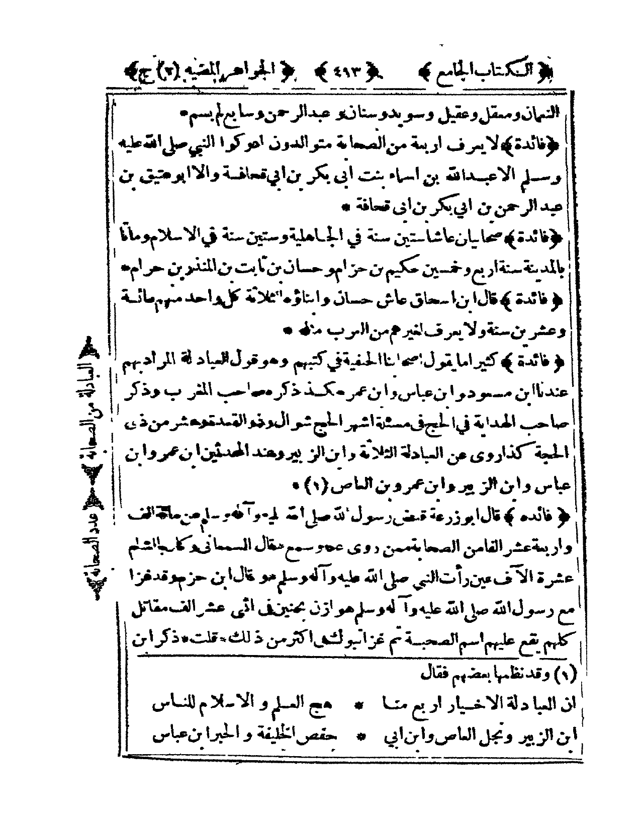 فَائِدَة لَا يعرف أَرْبَعَة من الصَّحَابَة متوالدون أدركوا النَّبِي صلى الله عَلَيْهِ وَسلم إِلَّا عبد الله بن أَسمَاء بنت أبي بكر بن أبي قُحَافَة وَإِلَّا أبوعتيق بن عبد الرَّحْمَن بن أبي بكر بن أبي قُحَافَة