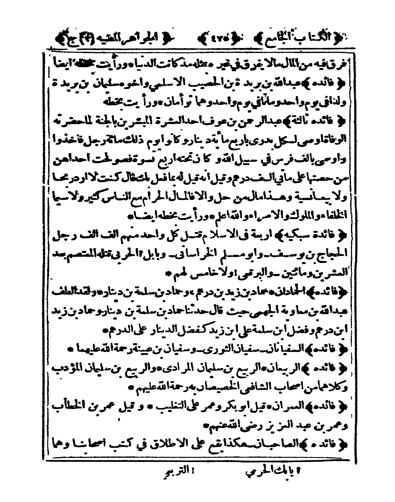 فَائِدَة ثَالِثَة عبد الرَّحْمَن بن عَوْف أحد الْعشْرَة المبشرين بِالْجنَّةِ لما حَضرته الْوَفَاة وصّى لكل بَدْرِي بِأَرْبَع مائَة دِينَار وَكَانُوا يَوْم ذَلِك مائَة رجل فَأخذُوا وَأوصى بِأَلف فرس فى سَبِيل الله وَكَانَ تحتة أَربع نسْوَة فصولحت احداهن من حصَّتهَا على ماتي ألف دِرْهَم وَقيل أَنه قبل لَهُ مَا فعل بك قَالَ كُنَّا لَا أرد ربحا وَلَا بيعا نسية وَهَذَا مَال من حل وَإِلَّا فَالْمَال الْحَرَام مَعَ النَّاس كثير وَلَا سِيمَا الْخُلَفَاء والملوك والأمراء وَالله أعلم وَرَأَيْت بِخَطِّهِ أَيْضا
