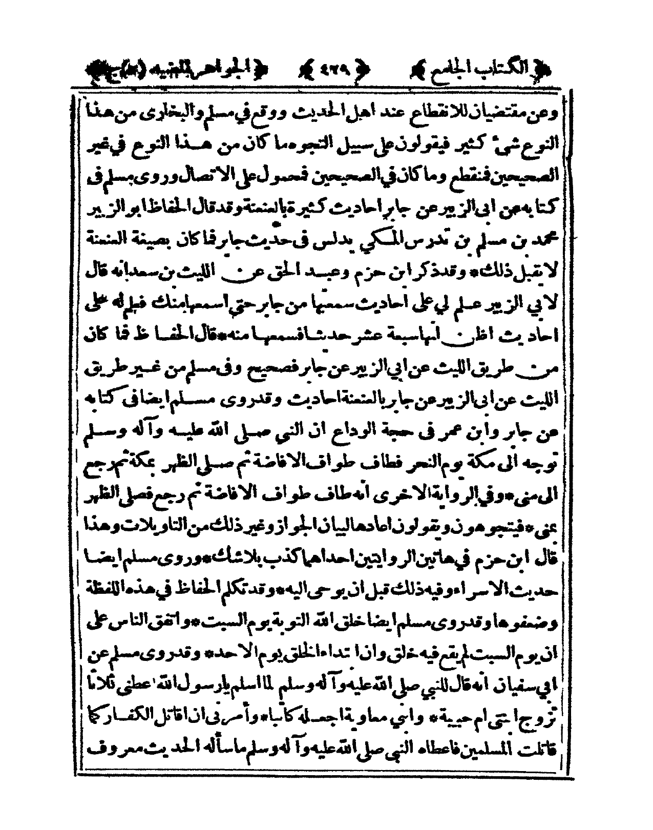 وَعَن مقتضيان للانقطاع عِنْد أهل الحَدِيث وَوَقع فى مُسلم وَالْبُخَارِيّ من هَذَا النَّوْع شئ كثير فَيَقُولُونَ على سَبِيل التجوه مَا كَانَ من هَذَا النَّوْع فى غير الصَّحِيحَيْنِ فمنقطع وَمَا كَانَ فى الصَّحِيحَيْنِ فَمَحْمُول على الِاتِّصَال وروى مُسلم فى كِتَابه عَن أبي الزبير عَن جَابر أَحَادِيث كَثِيرَة بالعنعنة وَقد قَالَ الْحَافِظ أَبُو الزبير مُحَمَّد بن مُسلم بن تدرس الْمَكِّيّ يُدَلس فى حَدِيث جَابر فَمَا كَانَ بِصِيغَة العنعنة لَا يقبل ذَلِك وَقد ذكر ابْن حزم وَعبد الْحق عَن اللَّيْث بن سعد أَنه قَالَ لأبي الزبير علم لي على أَحَادِيث سَمعتهَا من جَابر حَتَّى اسمعها مِنْك فَعلم لَهُ على أَحَادِيث أَظن أَنَّهَا سَبْعَة عشر حَدِيث فَسَمعَهَا مِنْهُ قَالَ الْحَافِظ فَمَا كَانَ من طَرِيق اللَّيْث عَن أبي الزبير عَن جَابر فَصَحِيح وفى مُسلم من غير طَرِيق اللَّيْث عَن أبي الزبير عَن جَابر بالعنعنة أَحَادِيث وَقد روى مُسلم أَيْضا فى كِتَابه عَن جَابر وَابْن عمر فى حجَّة الْوَدَاع أَن النَّبِي صلى الله عَلَيْهِ وَسلم توجه إِلَى مَكَّة يَوْم النَّحْر فَطَافَ طواف الْإِفَاضَة ثمَّ صلى الظّهْر بِمَكَّة ثمَّ رَجَعَ إِلَى منى وفى الرِّوَايَة الْأُخْرَى أَنه طَاف طواف الْإِفَاضَة ثمَّ رَجَعَ فصلى الظّهْر بمنى فيتجوهون وَيَقُولُونَ أَعَادَهَا لبَيَان الْجَوَاز وَغير ذَلِك من التأويلات وَهَذَا قَالَ ابْن حزم فى هَاتين الرِّوَايَتَيْنِ أَحدهمَا كذب بِلَا شكّ وروى مُسلم أَيْضا حَدِيث الْإِسْرَاء فِيهِ ذَلِك قبل أَن يُوحى إِلَيْهِ وَقد تكلم الْحفاظ فى هَذِه اللَّفْظَة وضعفوها وَقد روى مُسلم أَيْضا خلق الله التَّوْبَة يَوْم السبت وَاتفقَ النَّاس على أَن يَوْم السبت لم يَقع فِيهِ خلق وَأَن ابْتِدَاء الْخلق يَوْم الْأَحَد وَقد روى مُسلم عَن أبي سُفْيَان أَنه قَالَ للنَّبِي صلى الله عَلَيْهِ وَسلم لما أسلم يَا رَسُول الله أَعْطِنِي ثَلَاثًا تزوج ابنتى أم حَبِيبَة وَابْني مُعَاوِيَة اجْعَلْهُ كَاتبا وَأَمرَنِي أَن أقَاتل الْكفَّار كَمَا قَاتَلت الْمُسلمين فَأعْطَاهُ النَّبِي صلى الله عَلَيْهِ وَسلم مَا سَأَلَهُ الحَدِيث مَعْرُوف