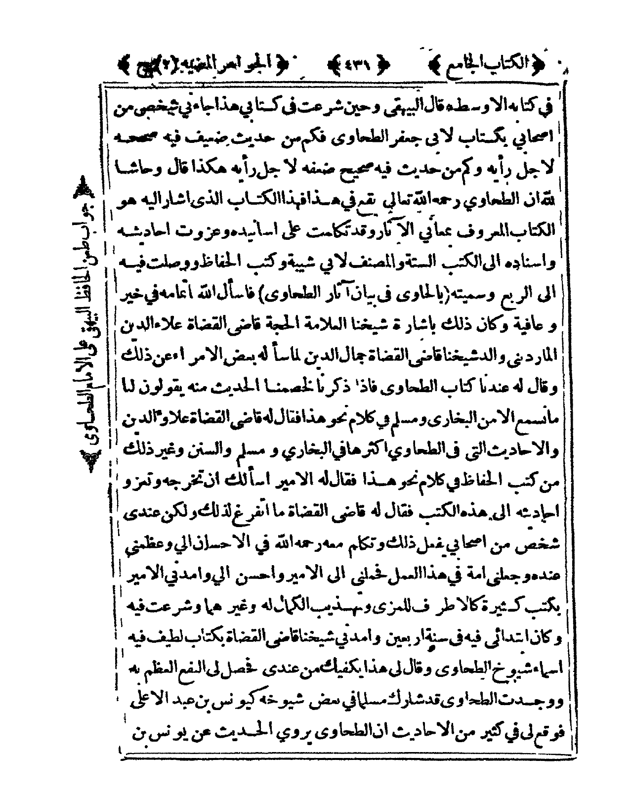فى كِتَابه الْأَوْسَط قَالَ البيهقى وَحين شرعت فى كتابي هَذَا جَاءَنِي شخص من أَصْحَابِي بِكِتَاب لأبي جَعْفَر الطَّحَاوِيّ فكم من حَدِيث ضَعِيف فِيهِ صَححهُ لأجل رَأْيه وَكم من حَدِيث فِيهِ صَحِيح ضعفه لأجل رَأْيه هَكَذَا قَالَ وحاشا لله أَن الطَّحَاوِيّ رَحمَه الله تَعَالَى يَقع فى هَذَا فَهَذَا الْكتاب الذى أَشَارَ إِلَيْهِ هُوَ الْكتاب الْمَعْرُوف بمعاني الْآثَار وَقد تَكَلَّمت على أسانيده وعزوت أَحَادِيثه وَإِسْنَاده إِلَى الْكتب السِّتَّة وَالْمُصَنّف لأبي شيبَة وَكتب الْحفاظ ووصلت فِيهِ إِلَى الرّبع وسميته بالحاوي فى بَيَان آثَار الطَّحَاوِيّ فاسأل الله اتمامه فى خير وعافية وَكَانَ ذَلِك بِإِشَارَة شَيخنَا الْعَلامَة الْحجَّة قَاضِي الْقُضَاة عَلَاء الدّين المارديني وَالِد شَيخنَا قَاضِي الْقُضَاة جمال الدّين لما سَأَلَهُ بعض الْأُمَرَاء عَن ذَلِك وَقَالَ لَهُ عندنَا كتاب الطَّحَاوِيّ فَإِذا ذكرنَا لخصمنا الحَدِيث مِنْهُ يَقُولُونَ لنا مَا نسْمع إِلَّا من البُخَارِيّ وَمُسلم فى كَلَام نَحْو هَذَا فَقَالَ لَهُ قَاضِي الْقُضَاة علاؤ الدّين وَالْأَحَادِيث الَّتِى فى الطَّحَاوِيّ أَكْثَرهَا فى البُخَارِيّ وَمُسلم وَالسّنَن وَغير ذَلِك من كتب الْحفاظ فى كَلَام نَحْو هَذَا فَقَالَ لَهُ الْأَمِير اسألك أَن تخرجه وتعزو أَحَادِيثه إِلَى هَذِه الْكتب فَقَالَ لَهُ قَاضِي الْقُضَاة مَا أتفرغ لذَلِك وَلَكِن عِنْدِي شخص من أَصْحَابِي يفعل ذَلِك وَتكلم مَعَه رَحمَه الله فى الْإِحْسَان إِلَيّ وعظمني عِنْده وَجَعَلَنِي أمة فى هَذَا الْعَمَل فَحَمَلَنِي إِلَى الْأَمِير وَأحسن إِلَيّ وأمدني الْأَمِير بكتب كَثِيرَة كالأطراف للمزي وتهذيب الْكَمَال لَهُ وَغَيرهمَا وشرعت فِيهِ وَكَانَ ابتدائي فِيهِ فى سنة أَرْبَعِينَ وأمدني شَيخنَا قَاضِي الْقُضَاة بِكِتَاب لطيف فِيهِ أَسمَاء شُيُوخ الطَّحَاوِيّ وَقَالَ لي هَذَا يَكْفِيك من عِنْدِي فَحصل لي النَّفْع الْعظم بِهِ وَوجدت الطَّحَاوِيّ وَقد شَارك مُسلما فى بعض شُيُوخه كيونس بن عبد الْأَعْلَى فَوَقع لي فى كثير من الْأَحَادِيث أَن الطَّحَاوِيّ يروي الحَدِيث عَن يُونُس بن