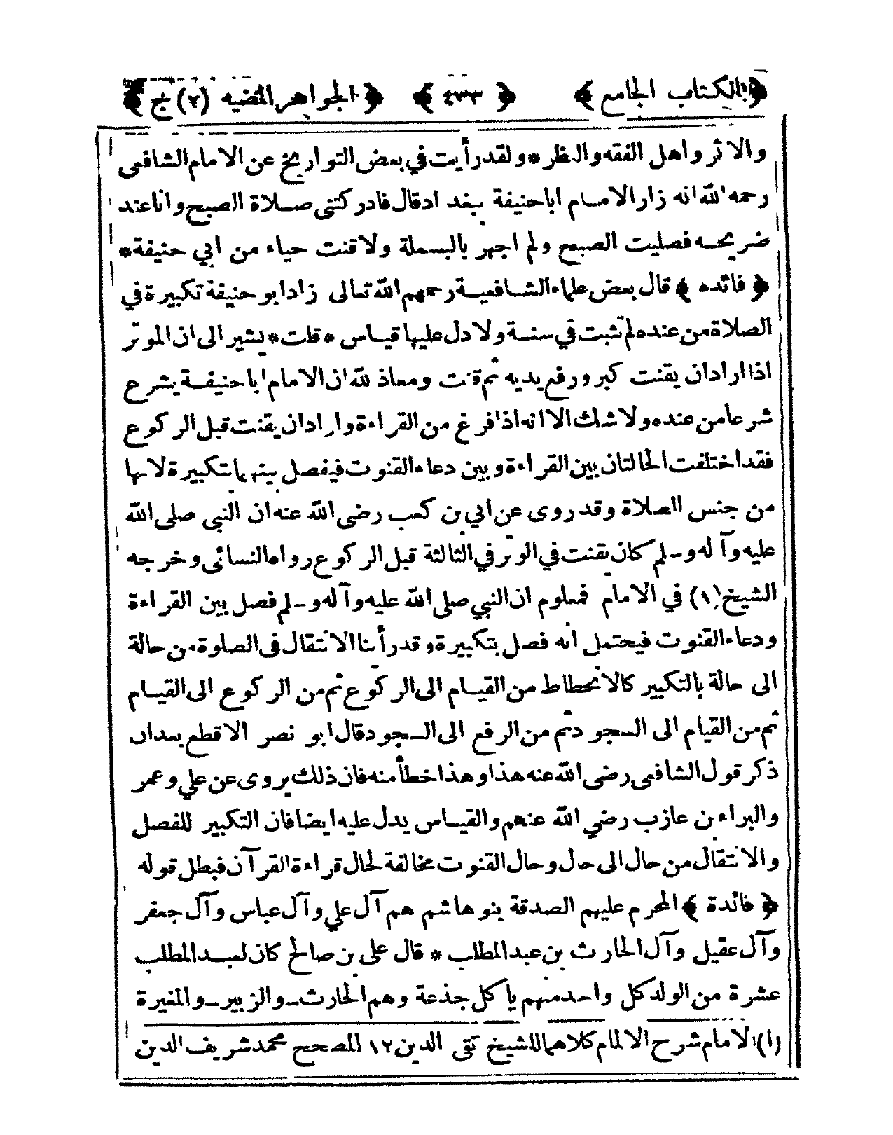 والأثر وَأهل الْفِقْه وَالنَّظَر وَلَقَد رَأَيْت فى بعض التواريخ عَن الإِمَام الشَّافِعِي رَحمَه الله أَنه زار الإِمَام أَبَا حنيفَة بِبَغْدَاد قَالَ فأدركتني صَلَاة الصُّبْح وَأَنا عِنْد ضريحه فَصليت الصُّبْح وَلم أَجْهَر بالبسملة ولاقنت حَيَاء من أبي حنيفَة