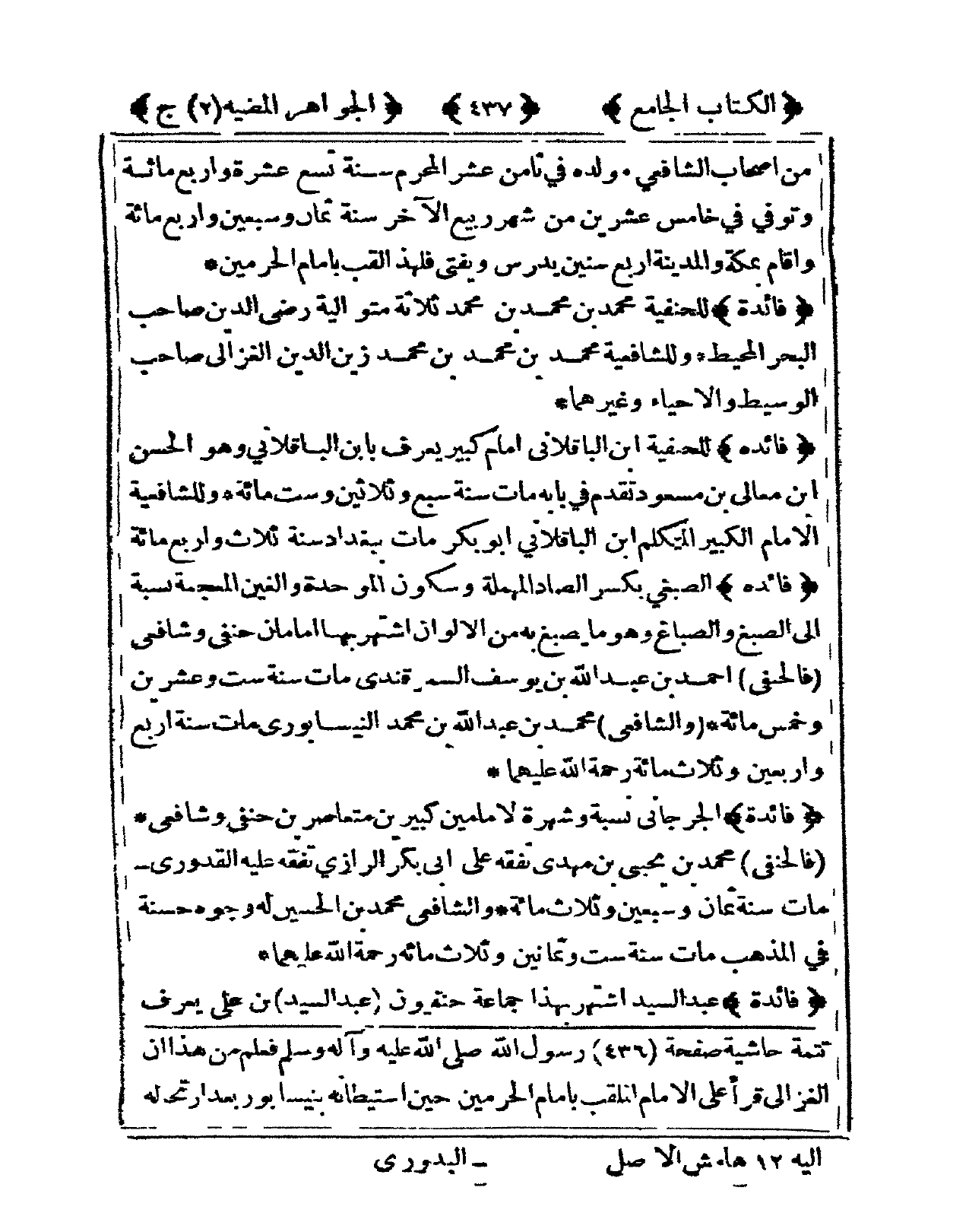 فَائِدَة الْجِرْجَانِيّ نِسْبَة وشهرة لإمامين كبيرين متعاصرين حَنَفِيّ وشافعي فالحنفي مُحَمَّد بن يحيى بن مهْدي تفقه على أبي بكر الرَّازِيّ تفقه عَلَيْهِ الْقَدُورِيّ مَاتَ سنة ثَمَان وَسبعين وَثَلَاث مائَة وَالشَّافِعِيّ مُحَمَّد بن الْحُسَيْن لَهُ وُجُوه حَسَنَة فى الْمَذْهَب مَاتَ سنة سِتّ وَثَمَانِينَ وَثَلَاث مائَة رَحْمَة الله عَلَيْهِمَا
