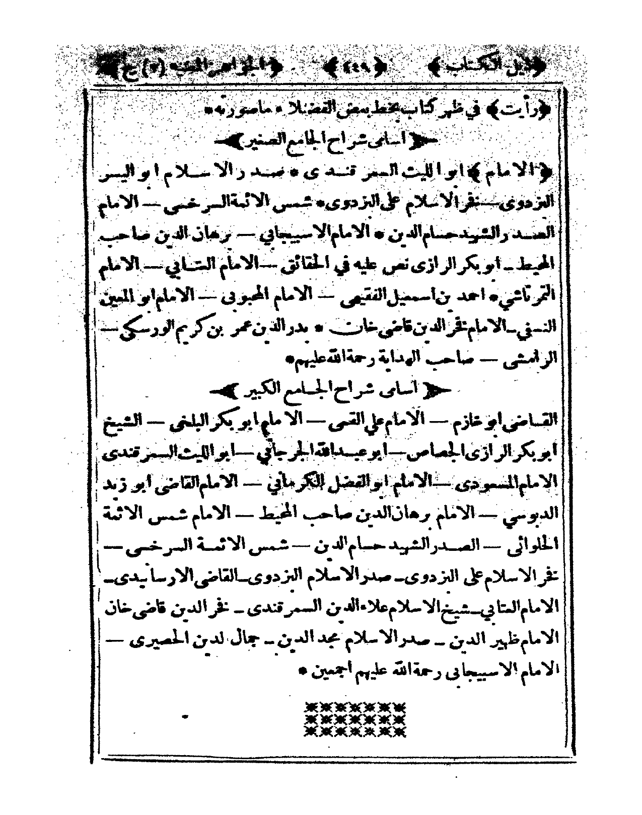 الإِمَام أَبُو اللَّيْث السَّمرقَنْدِي صدر الْإِسْلَام أَبُو الْيُسْر الْبَزْدَوِيّ فَخر الْإِسْلَام عَليّ الْبَزْدَوِيّ شمس الْأَئِمَّة السَّرخسِيّ الإِمَام الصَّدْر الشَّهِيد حسام الدّين الإِمَام الْإِسْبِيجَابِيّ برهَان الدّين صَاحب الْمُحِيط أَبُو بكر الرَّازِيّ نَص عَلَيْهِ فى الْحَقَائِق الإِمَام العتابي الامام التُّمُرْتَاشِيّ أَحْمد بن اسمعيل الفقهي الإِمَام المحبوبي الإِمَام أَبُو الْمعِين النَّسَفِيّ الإِمَام فَخر الدّين قَاضِي خَان بدر الدّين عمر بن كريم الورسكي الرامشي صَاحب الْهِدَايَة رَحْمَة الله عَلَيْهِم