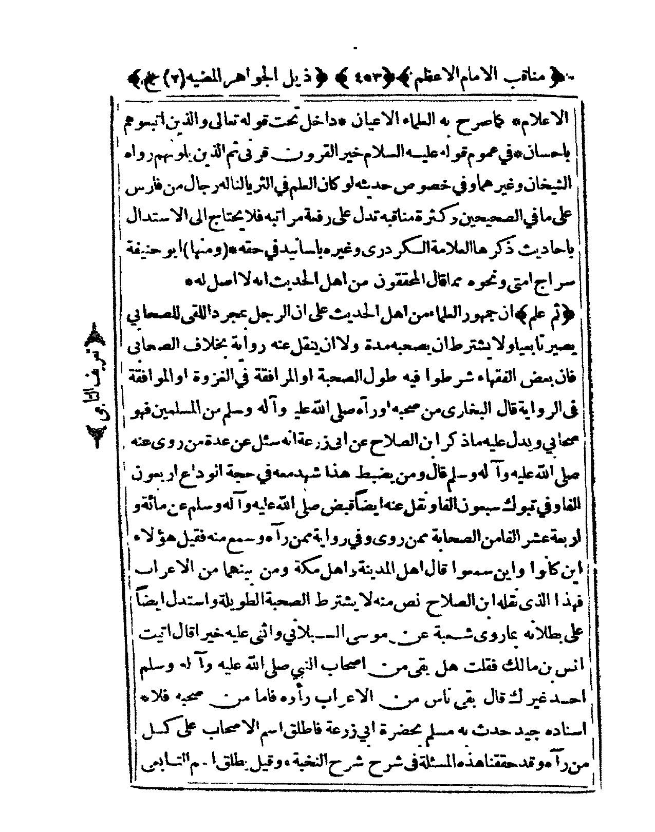 الْإِعْلَام كَمَا صرح بِهِ الْعلمَاء الْأَعْيَان دَاخل تَحت قَوْله تَعَالَى {وَالَّذين اتَّبَعُوهُمْ بِإِحْسَان} فى عُمُوم قَوْله عَلَيْهِ السَّلَام خير الْقُرُون قَرْني ثمَّ الَّذين يَلُونَهُمْ رَوَاهُ الشَّيْخَانِ وَغَيرهمَا وفى خُصُوص حَدِيثَة لَو كَانَ الْعلم فى الثريا لنا لَهُ رجال من فَارس على مَا فى الصَّحِيحَيْنِ وَكَثْرَة مناقبه تدل على رفْعَة مراتبه فَلَا يحْتَاج إِلَى الإستدال بِأَحَادِيث ذكرهَا الْعَلامَة الكردري وَغَيره بأسانيد فى حَقه وَمِنْهَا أَبُو حنيفَة سراج أمتِي وَنَحْوه مِمَّا قَالَ الْمُحَقِّقُونَ من أهل الحَدِيث أَنه لَا أصل لَهُ