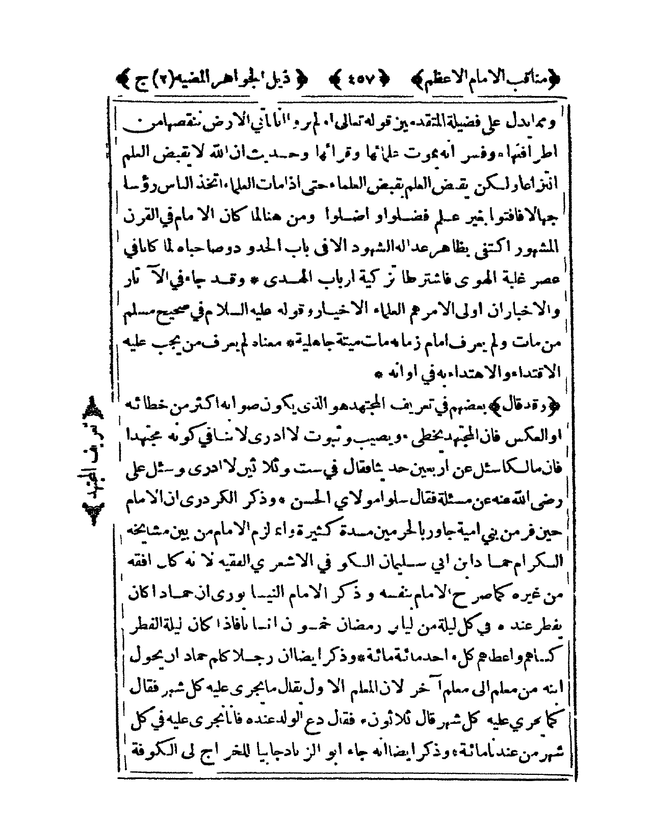 وَقد قَالَ بَعضهم فى تَعْرِيف الْمُجْتَهد هُوَ الذى يكون صَوَابه أَكثر من خطائه أَو الْعَكْس فَإِن الْمُجْتَهد يُخطئ ويصيب وَثُبُوت لَا أَدْرِي لَا يُنَافِي كَونه مُجْتَهدا فَإِن مَالِكًا سُئِلَ عَن أَرْبَعِينَ حَدِيثا فَقَالَ فى سِتّ وَثَلَاثِينَ لَا أَدْرِي وَسُئِلَ عَليّ رَضِي الله عَنهُ عَن مسئلة فَقَالَ سلوا مولَايَ الْحسن وَذكر الكردري أَن الإِمَام حِين فر من بني أُميَّة جاور بالحرمين مُدَّة كَثِيرَة وَإِنَّمَا لزم الإِمَام من بَين مشايخه الْكِرَام حَمَّاد ابْن أبي سُلَيْمَان الْكُوفِي الْأَشْعَرِيّ الْفَقِيه لِأَنَّهُ كَانَ أفقه من غَيره كَمَا صرح الإِمَام بِنَفسِهِ وَذكر الإِمَام النَّيْسَابُورِي أَن حمادا كَانَ يفْطر عِنْده فى كل لَيْلَة من ليَالِي رَمَضَان خَمْسُونَ إنْسَانا فَإِذا كَانَ لَيْلَة الْفطر كساهم وَأَعْطَاهُمْ كل وَاحِد مائَة مائَة وَذكر أَيْضا أَن رجلا كلم حمادا أَن يحول ابْنه من معلم إِلَى معلم آخر لِأَن الْمعلم الأول يُقَال مَا يجْرِي عَلَيْهِ كل شهر فَقَالَ كَمَا يجْرِي عَلَيْهِ كل شهر قَالَ ثَلَاثُونَ فَقَالَ دع الْوَلَد عِنْده فَإنَّا نجري عَلَيْهِ فى كل شهر من عندنَا مائَة وَذكر أَيْضا أَنه جَاءَ أَبُو الزِّنَاد جابيا للخراج إِلَى الْكُوفَة