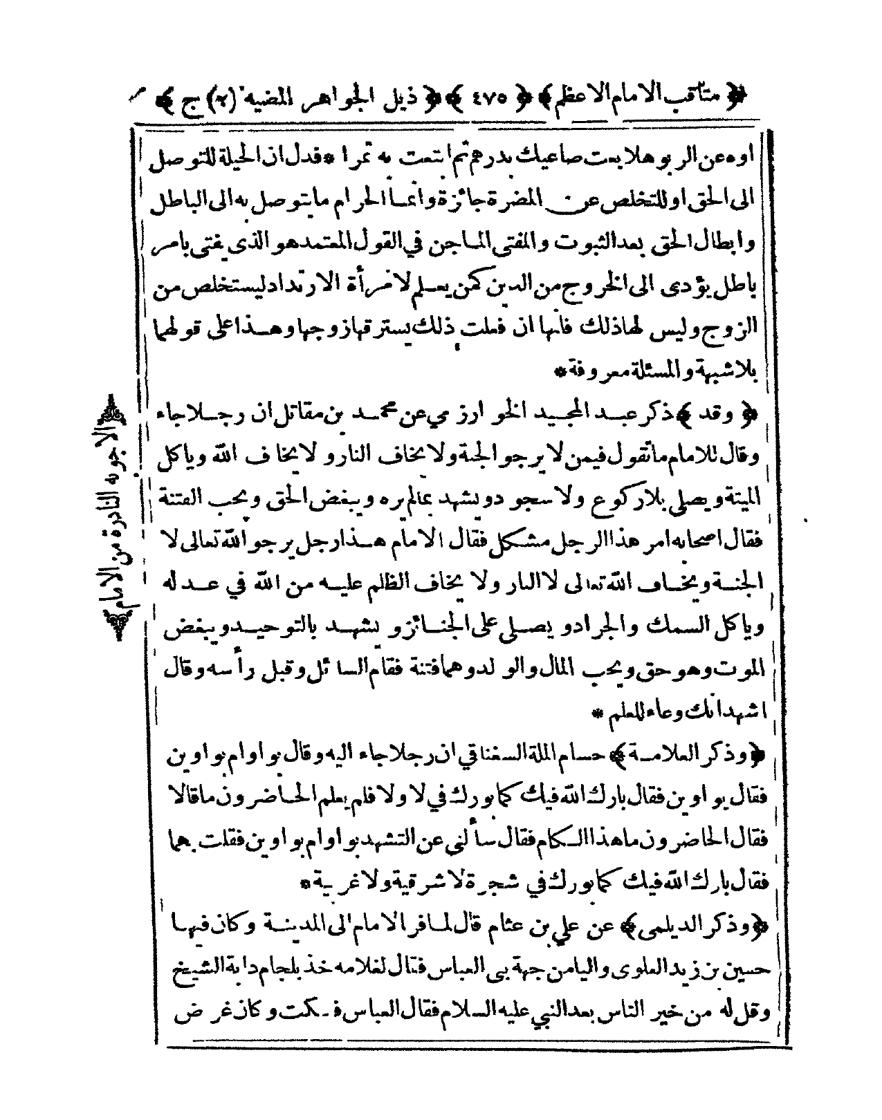 وَقد ذكر عبد الْمجِيد الْخَوَارِزْمِيّ عَن مُحَمَّد بن مقَاتل أَن رجلا جَاءَ وَقَالَ للْإِمَام مَا تَقول فِيمَن لَا يَرْجُو الْجنَّة وَلَا يخَاف النَّار وَلَا يخَاف الله وَيَأْكُل الْميتَة وَيُصلي بِلَا رُكُوع وَلَا سُجُود وَيشْهد بِمَا لم يره ويبغظ الْحق وَيُحب الْفِتْنَة فَقَالَ أَصْحَابه أَمر هَذَا الرجل مُشكل فَقَالَ الإِمَام هَذَا رجل يَرْجُو الله تَعَالَى لاالجنة وَيخَاف الله تَعَالَى لَا النَّار وَلَا يخَاف الظُّلم عَلَيْهِ من الله فى عدله وَيَأْكُل السّمك وَالْجَرَاد وَيُصلي على الْجَنَائِز وَيشْهد بِالتَّوْحِيدِ وَيبغض الْمَوْت وَهُوَ حق وَيُحب المَال وَالْولد وهما فتْنَة فَقَامَ السَّائِل وَقبل رَأسه وَقَالَ أشهد أَنَّك وعَاء للْعلم