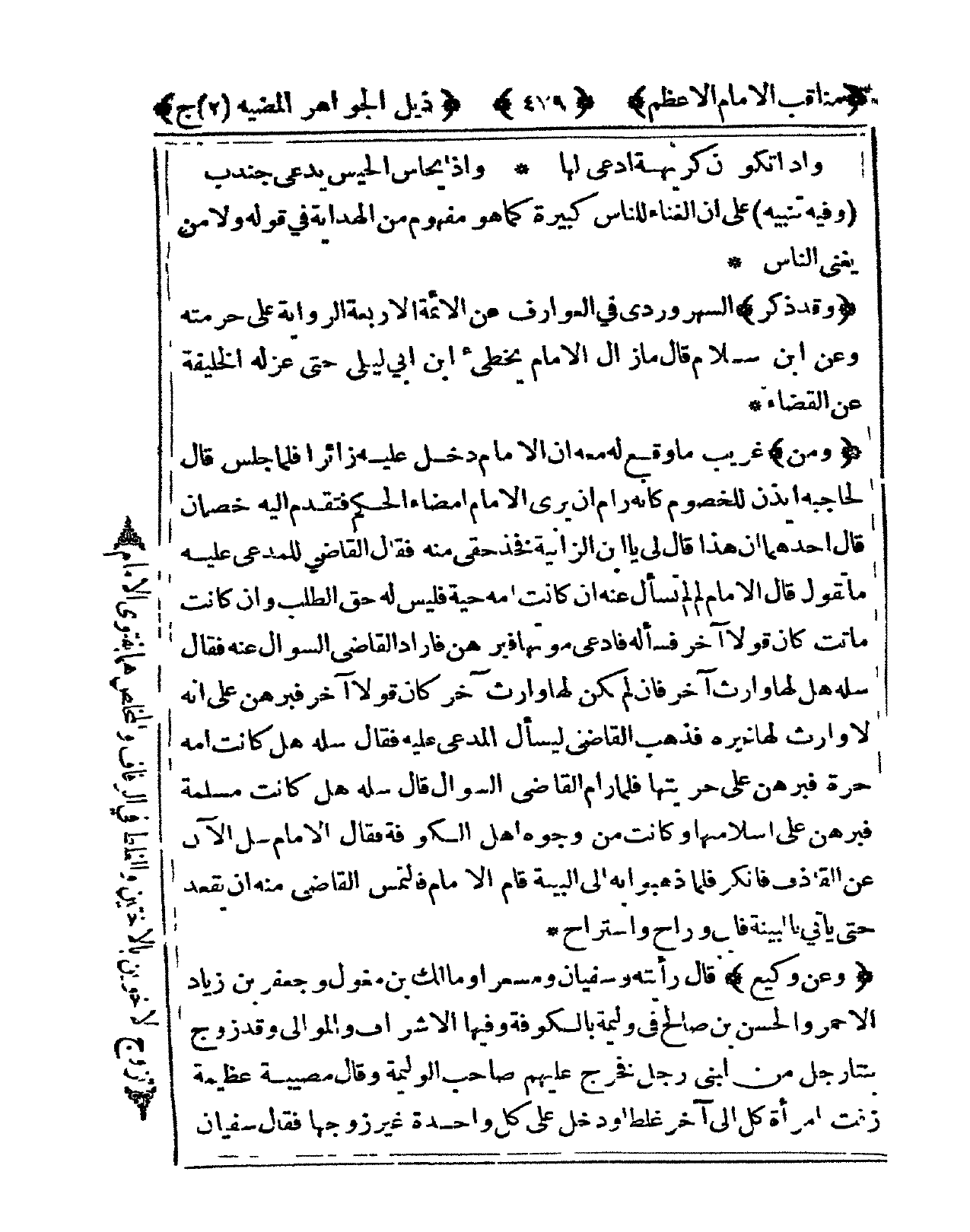 وَمن غَرِيب مَا وَقع لَهُ مَعَه أَن الإِمَام دخل عَلَيْهِ زَائِرًا فَلَمَّا جلس قَالَ لحاجبه أيذن للخصوم كَأَنَّهُ رام أَن يرى الإِمَام امضاء الحكم فَتقدم إِلَيْهِ خصمان قَالَ أَحدهمَا إِن هَذَا قَالَ لي يَا ابْن الزَّانِيَة فَخذ حَقي مِنْهُ فَقَالَ القَاضِي للْمُدَّعِي عَلَيْهِ مَا تَقول قَالَ الإِمَام لم لم تسْأَل عَنهُ إِن كَانَت أمه حَيَّة فَلَيْسَ لَهُ حق الطّلب وَإِن كَانَت مَاتَت كَانَ قولا آخر فَسَأَلَهُ فَادّعى مَوتهَا فبرهن فَأَرَادَ القَاضِي السوال عَنهُ فَقَالَ سَله هَل لَهَا وَارِث آخر فَإِن لم يكن لَهَا وَارِث آخر كَانَ قولا آخر فبرهن على أَنه لَا وَارِث لَهَا غَيره فَذهب القَاضِي ليسأل الْمُدَّعِي عَلَيْهِ فَقَالَ سَله هَل كَانَت أمه حرَّة فبرهن على حريتها فَلَمَّا رام القَاضِي السوال قَالَ سَله هَل كَانَت مسلمة فبرهن على إسْلَامهَا وَكَانَت من وُجُوه أهل الْكُوفَة فَقَالَ الإِمَام سل الْآن عَن الْقَاذِف فَأنْكر فَلَمَّا ذَهَبُوا بِهِ إِلَى الْبَيِّنَة قَامَ الإِمَام فالتمس القَاضِي مِنْهُ أَن يقْعد حَتَّى يَأْتِي بِالْبَيِّنَةِ فَأبى وَرَاح واستراح