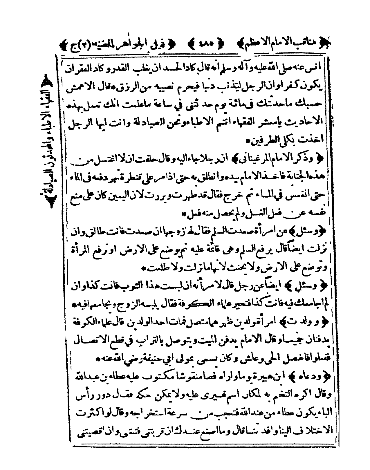 وَولدت امْرَأَة وَلدين ظهرهما مُتَّصِل فَمَاتَ أحد الْوَلَدَيْنِ قَالَ عُلَمَاء الْكُوفَة يدفنان جَمِيعًا وَقَالَ الإِمَام يدْفن الْمَيِّت ويتوصل بِالتُّرَابِ فى قطع الِاتِّصَال فَفَعَلُوا فانفصل الْحَيّ وعاش وَكَانَ يُسمى بمولى أبي حنيفَة رَضِي الله عَنهُ