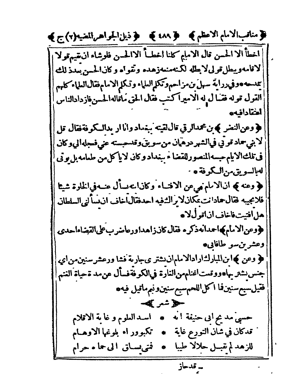 وَعَن الْمُبَارك أَرَادَ الإِمَام أَن يَشْتَرِي جَارِيَة فَشَاور عشر سِنِين من أَي جنس يَشْتَرِيهَا وَوَقعت أَغْنَام من الْغَارة فى الْكُوفَة فَسَأَلَ عَن مُدَّة حَيَاة الْغنم فَقيل سبع سِنِين فَمَا أكل اللَّحْم سبع سِنِين وَنعم مَا قيل فِيهِ شعر ... حسبي مديح أبي حنيفَة أَنه ... أَسد الْعُلُوم وغابة الأقلام