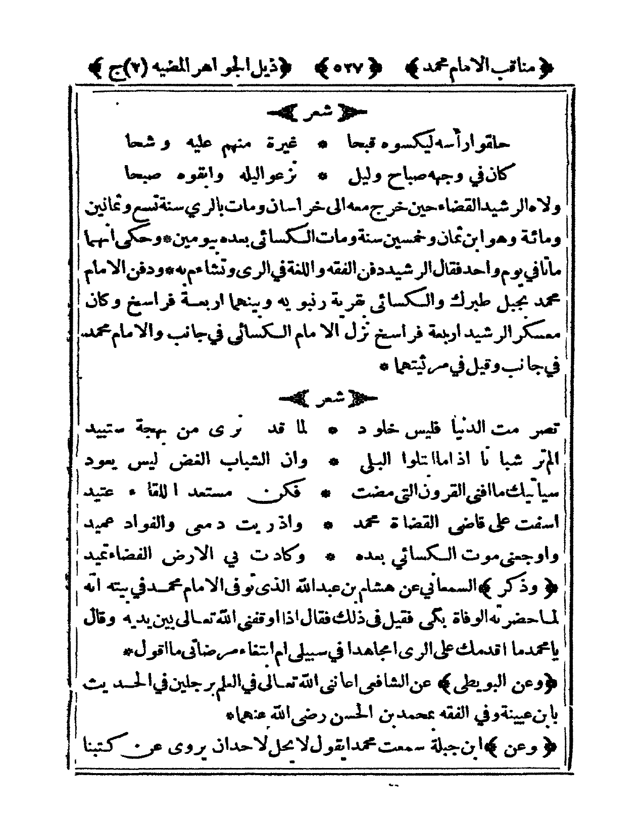 ولاه الرشيد الْقَضَاء حِين خرج مَعَه إِلَى خُرَاسَان وَمَات بِالريِّ سنة تسع وَثَمَانِينَ وَمِائَة وَهُوَ ابْن ثَمَان وَخمسين سنة وَمَات الْكسَائي بعده بيومين وَحكى أَنَّهُمَا مَاتَا فى يَوْم وَاحِد فَقَالَ الرشيد دفن الْفِقْه واللغة فى الرّيّ وتشاءم بِهِ وَدفن الإِمَام مُحَمَّد بجبل طبرك وَالْكسَائِيّ بقرية رنبويه وَبَينهمَا أَرْبَعَة فراسخ وَكَانَ معسكر الرشيد أَرْبَعَة فراسخ نزل الإِمَام الْكسَائي فى جَانب وَالْإِمَام مُحَمَّد فى جَانب وَقيل فِي مرثيتهما شعر ... تصرمت الدُّنْيَا فَلَيْسَ خُلُود ... لما قد نرى من بهجة ستبيد