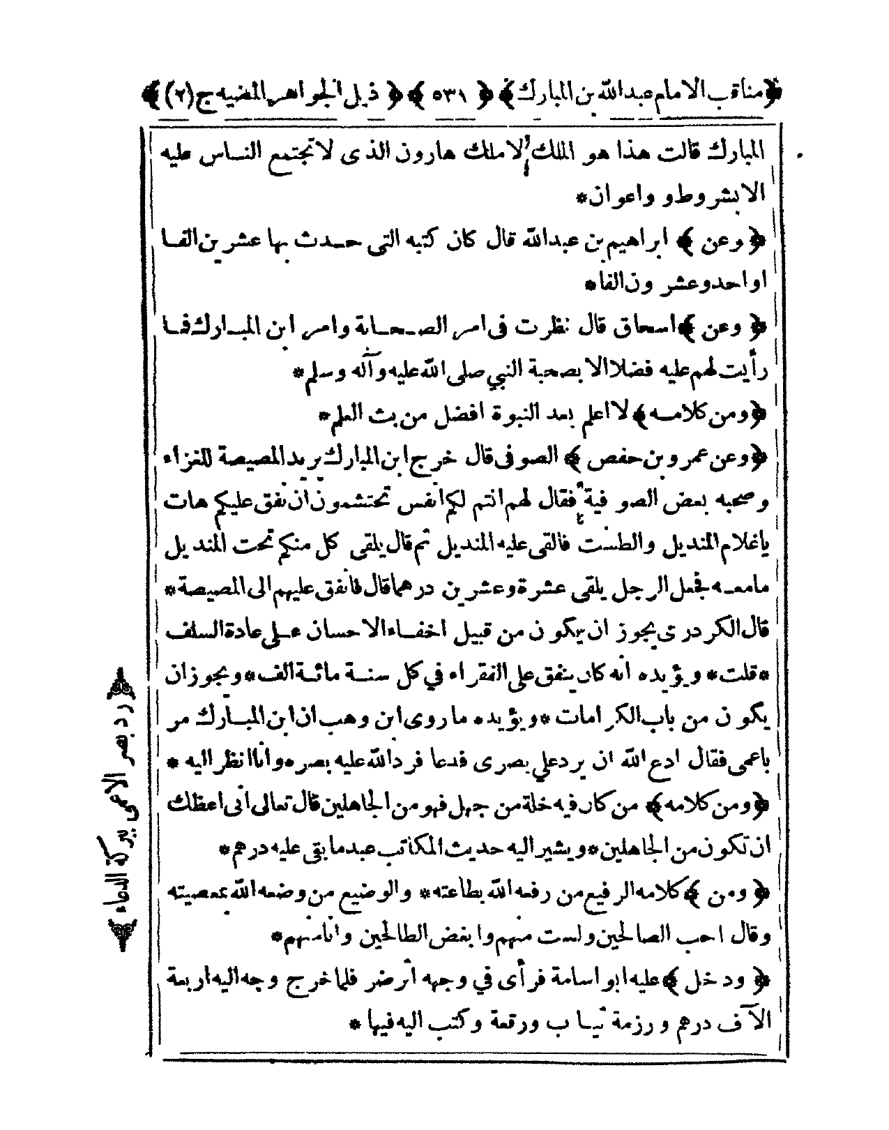وَعَن عَمْرو بن حَفْص الصُّوفِي قَالَ خرج ابْن الْمُبَارك يُرِيد المصيصة للغزاء وَصَحبه بعض الصُّوفِيَّة فَقَالَ لَهُم أَنْتُم لَكِن أنفس تحتشمون أَن نفق عَلَيْكُم هَات يَا غُلَام المنديل والطست فَألْقى عَلَيْهِ المنديل ثمَّ قَالَ يلقِي كل مِنْكُم تَحت المنديل مَا مَعَه فَجعل الرجل يلقِي عشرَة وَعشْرين درهما قَالَ فأنفق عَلَيْهِم إِلَى المصيصة قَالَ الكردري يجوز أَن يكون من قبيل إخفاء الْإِحْسَان على عَادَة السّلف قلت ويأيده أَنه كَانَ ينْفق على الْفُقَرَاء فى كل سنة مائَة ألف وَيجوز أَن يكون من بَاب الكرامات وَيُؤَيِّدهُ مَا روى ابْن وهب أَن ابْن الْمُبَارك مر بأعمى فَقَالَ ادعوا الله أَن يرد الله عَليّ بَصرِي فَدَعَا فَرد الله عَلَيْهِ بَصَره وَأَنا أنظر إِلَيْهِ