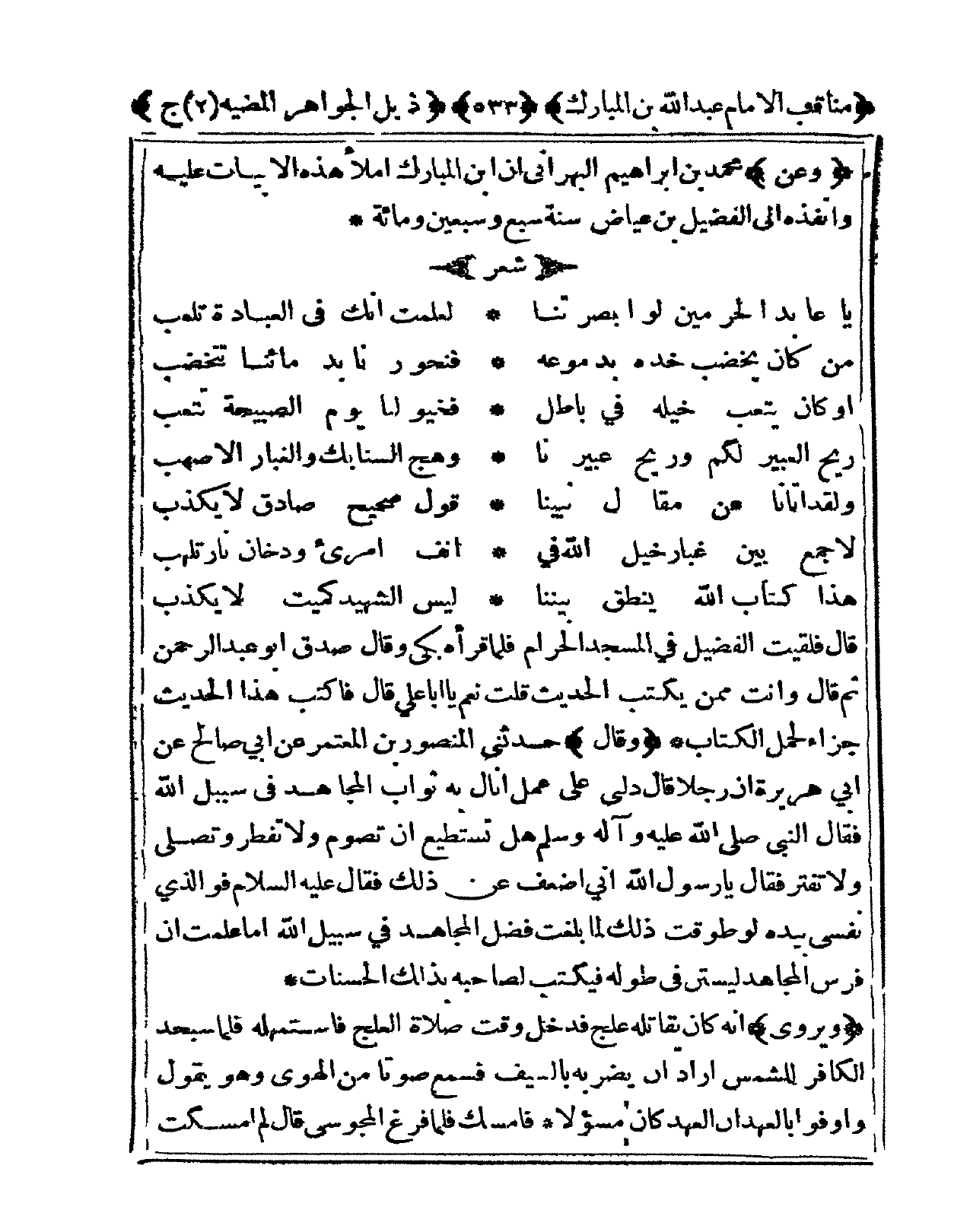 وَعَن مُحَمَّد بن إِبْرَاهِيم البهراني أَن ابْن الْمُبَارك أملأ هَذِه الأبيات عَلَيْهِ وأنفذه إِلَى الفضيل ابْن عِيَاض سنة سبع وَسبعين وَمِائَة شعر ... يَا عَابِد الْحَرَمَيْنِ لَو أبصرتنا ... لعَلِمت أَنَّك فى الْعِبَادَة تلعب