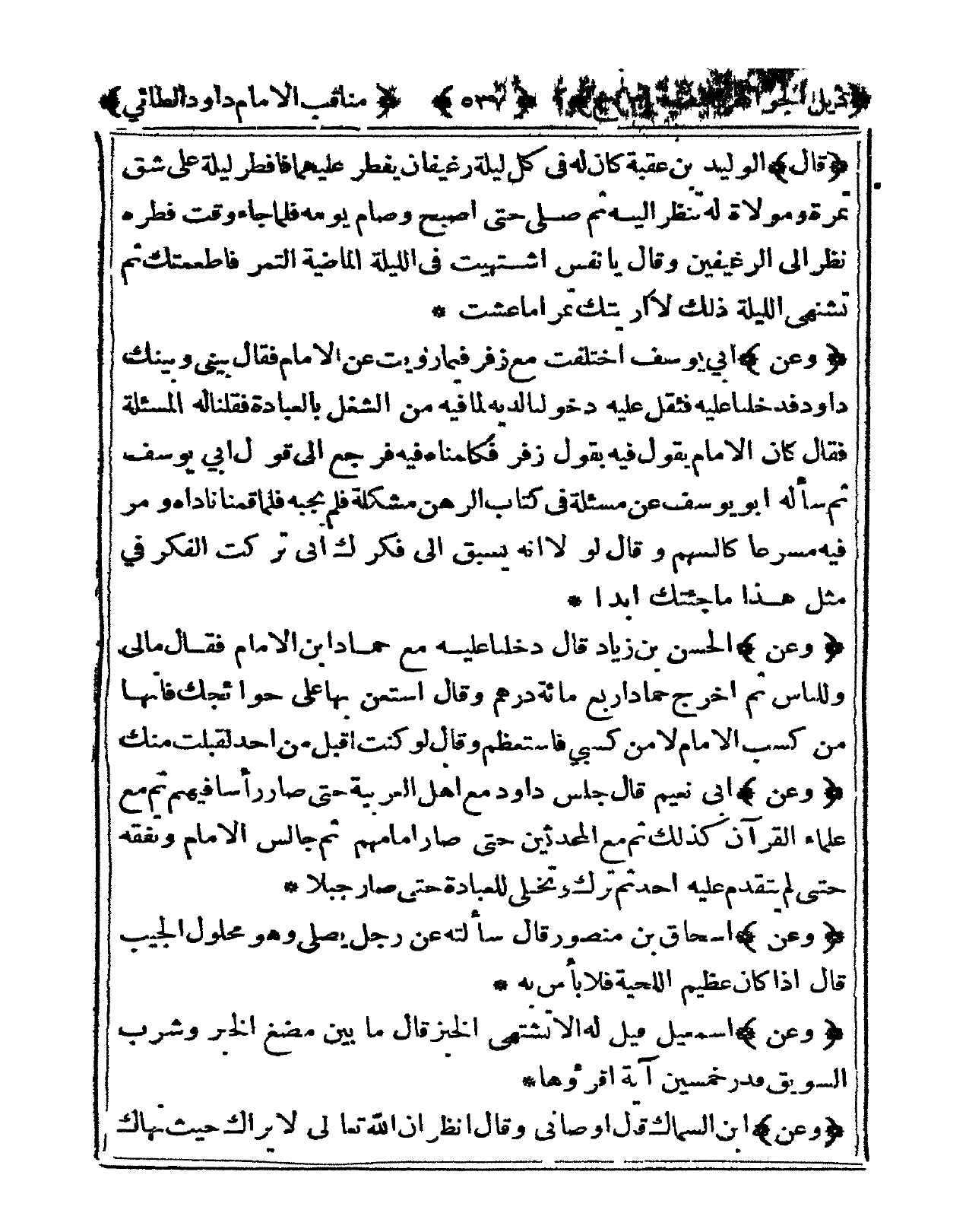 وَعَن أبي يُوسُف اخْتلفت مَعَ زفر فِيمَا رويت عَن الإِمَام فَقَالَ بيني وَبَيْنك دَاوُد فَدَخَلْنَا عَلَيْهِ فثقل عَلَيْهِ دخولنا لَدَيْهِ لما فِيهِ من الشّغل بِالْعبَادَة فَقُلْنَا لَهُ المسئلة فَقَالَ كَانَ الإِمَام يَقُول فِيهِ بقول زفر فكلمناه فِيهِ فَرجع إِلَى قَول أبي يُوسُف ثمَّ سَأَلَهُ أَبُو يُوسُف عَن مسئلة فى كتاب الرَّهْن مشكلة فَلم يجبهُ فَلَمَّا قمنا ناداه وَمر فِيهِ مسرعا كالسهم وَقَالَ لَوْلَا أَنه يسْبق إِلَى فكرك إِنِّي تركت الْفِكر فى مثل هَذَا مَا جئْتُك أبدا