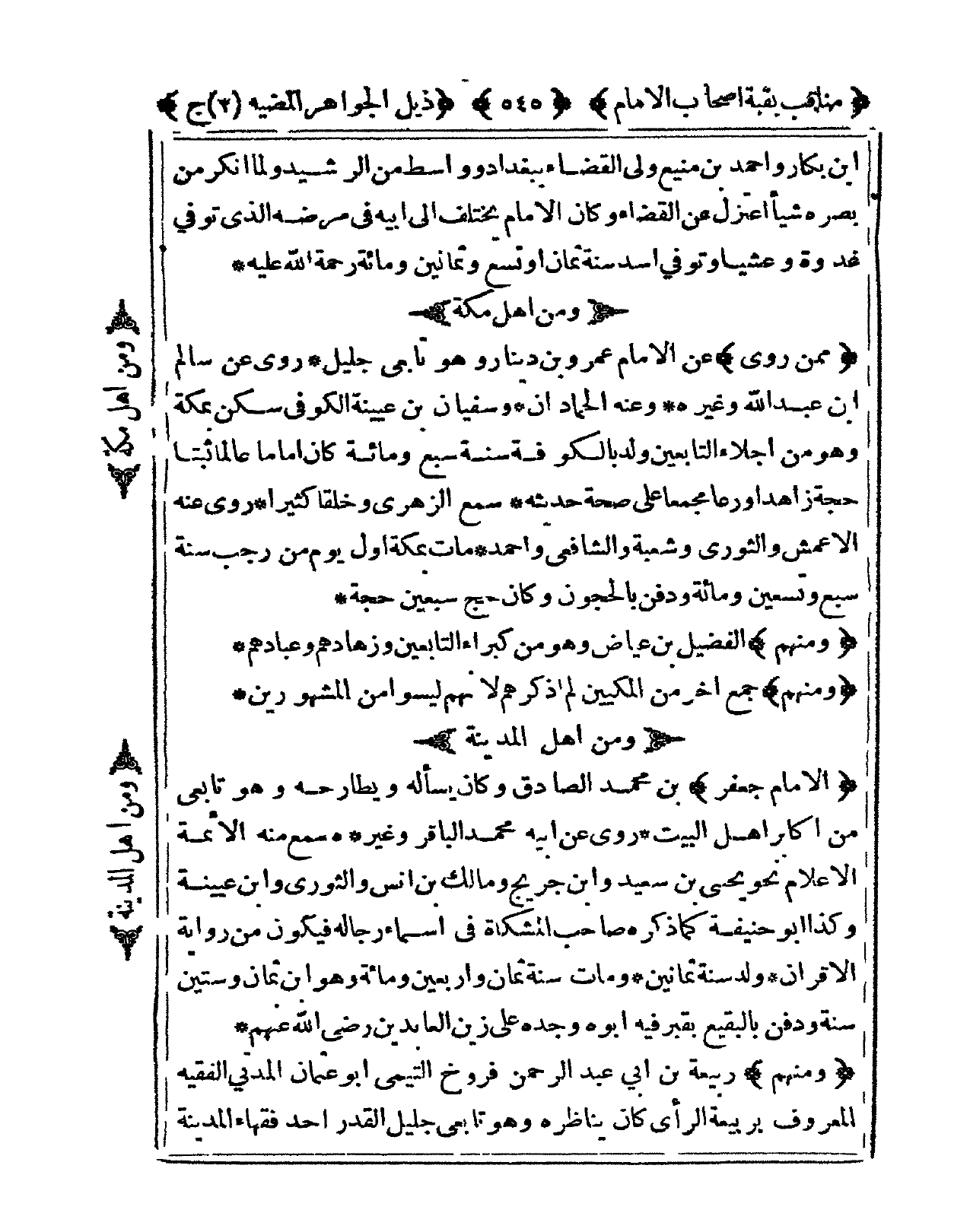 الإِمَام جَعْفَر بن مُحَمَّد الصَّادِق وَكَانَ يسْأَله ويطارحه وَهُوَ تَابِعِيّ من أكَابِر أهل الْبَيْت روى عَن أَبِيه مُحَمَّد الباقر وَغَيره سمع مِنْهُ الْأَئِمَّة الْأَعْلَام نَحْو يحيى بن سعيد وَابْن جريج وَمَالك بن أنس وَالثَّوْري وَابْن عُيَيْنَة وَكَذَا أَبُو حنيفَة كَمَا ذكره صَاحب الْمشكاة فى أَسمَاء رِجَاله فَيكون من رِوَايَة الأقران ولد سنة ثَمَانِينَ وَمَات سنة ثَمَان أَرْبَعِينَ وَمِائَة وَهُوَ ابْن ثَمَان وَسِتِّينَ سنة وَدفن بِالبَقِيعِ بِقَبْر فِيهِ أَبوهُ وجده عَليّ زين العابدين رَضِي الله عَنْهُم
