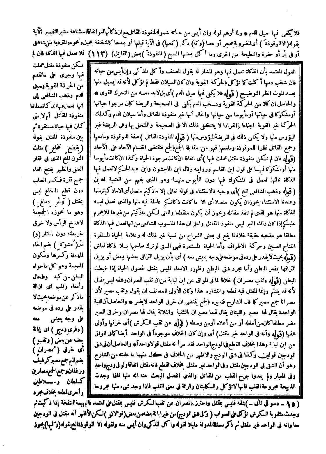 فَلَا يَكْفِي فِيهَا سَيْلُ الدَّمِ، وَلَمَّا أَوْهَمَ قَوْلُهُ: وَإِنْ أَيِسَ مِنْ حَيَاتِهِ شُمُولَهُ لِمَنْفُوذَةِ الْمَقَاتِلِ مَعَ أَنَّ ذَكَاتَهَا لَغْوٌ اتِّفَاقًا اسْتَثْنَاهَا مُشِيرًا لِتَفْسِيرِ الْآيَةِ بِقَوْلِهِ (إلَّا الْمَوْقُوذَةَ) أَيْ الْمَضْرُوبَةَ بِحَجَرٍ أَوْ عَصًا (وَمَا) ذُكِرَ (مَعَهَا) فِي الْآيَةِ قَبْلَهَا أَوْ بَعْدَهَا كَالْمُنْخَنِقَةِ بِحَبْلٍ وَنَحْوِهِ وَالْمُتَرَدِّيَةِ مِنْ شَاهِقٍ أَوْ فِي بِئْرٍ أَوْ حُفْرَةٍ وَالنَّطِيحَةِ مِنْ أُخْرَى، وَمَا أَكَلَ بَعْضَهَا السَّبُعُ (الْمَنْفُوذَةَ) بَعْضَ (الْمَقَاتِلِ) فَلَا تَعْمَلُ فِيهَا الذَّكَاةُ فَإِنْ لَمْ تَكُنْ مَنْفُوذَةَ مَقْتَلٍ عَمِلَتْ فِيهَا وَجَرَى عَلَى مَا تَقَدَّمَ مِنْ الْحَرَكَةِ الْقَوِيَّةِ وَسَيْلِ الدَّمِ، وَذَهَبَ الشَّافِعِيُّ إلَى أَنَّهَا تَعْمَلُ فِيهَا الذَّكَاةُ مُطْلَقًا مَنْفُوذَةَ الْمَقَاتِلِ أَمْ لَا مَتَى كَانَ فِيهَا حَيَاةٌ مُسْتَقِرَّةٌ ثُمَّ بَيَّنَ مَنْفُوذَةَ الْمَقْتَلِ بِقَوْلِهِ (بِقَطْعِ نُخَاعٍ) مُثَلَّثُ النُّونِ الْمُخُّ الَّذِي فِي فَقَارِ الْعُنُقِ وَالظَّهْرِ بِفَتْحِ الْفَاءِ جَمْعُ فَقَرَةٍ فَكَسْرُ الصُّلْبِ دُونَ قَطْعِ النُّخَاعِ لَيْسَ بِمَقْتَلٍ (وَنَثْرُ دِمَاغٍ) ، وَهُوَ مَا تَحُوزُهُ الْجُمْجُمَةُ لَا شَدْخُ الرَّأْسِ، وَلَا خَرْقُ خَرِيطَتِهِ دُونَ انْتِثَارٍ (وَ) نَثْرُ (حُشْوَةٍ) بِضَمِّ الْحَاءِ الْمُهْمَلَةِ، وَكَسْرِهَا وَسُكُونِ الْمُعْجَمَةِ، وَهُوَ كُلُّ مَا حَوَاهُ الْبَطْنُ مِنْ كَبِدٍ وَطِحَالٍ وَأَمْعَاءٍ وَقَلْبٍ، أَيْ إزَالَةِ مَا ذُكِرَ عَنْ مَوْضِعِهِ بِحَيْثُ لَا يَقْدِرُ عَلَى رَدِّهِ فِي مَوْضِعِهِ عَلَى وَجْهٍ يَعِيشُ مَعَهُ (وَفَرْيِ وَدَجٍ) أَيْ إبَانَةِ بَعْضِهِ عَنْ بَعْضٍ (وَثَقْبِ) أَيْ خَرْقِ (مُصْرَانٍ) بِضَمِّ الْمِيمِ جَمْعُ مَصِيرٍ كَرَغِيفٍ وَرُغْفَانٍ وَجَمْعُ الْجَمْعِ مَصَارِينُ كَسُلْطَانٍ وَسَلَاطِينَ، وَأَحْرَى قَطْعُهُ بِخِلَافِ مُجَرَّدِ شَقِّهِ فَلَيْسَ بِمَقْتَلٍ وَاحْتَرَزَ بِالْمُصْرَانِ عَنْ ثَقْبِ الْكَرْشِ فَلَيْسَ بِمَقْتَلِ عَلَى الْمُعْتَمَدِ فَالْبَهِيمَةُ الْمُنْتَفِخَةُ إذَا ذُكِّيَتْ ثُمَّ وُجِدَتْ مَثْقُوبَةَ الْكَرْشِ تُؤْكَلُ عَلَى الصَّوَابِ (وَفِي) (شَقِّ الْوَدَجِ) مِنْ غَيْرِ إبَانَةِ بَعْضِهِ مِنْ بَعْضٍ (قَوْلَانِ) لَكِنَّ الْأَظْهَرَ أَنَّهُ مَقْتَلٌ فِي الْوَدَجَيْنِ مَعًا، وَأَنَّهُ فِي الْوَاحِدِ غَيْرُ مَقْتَلٍ.