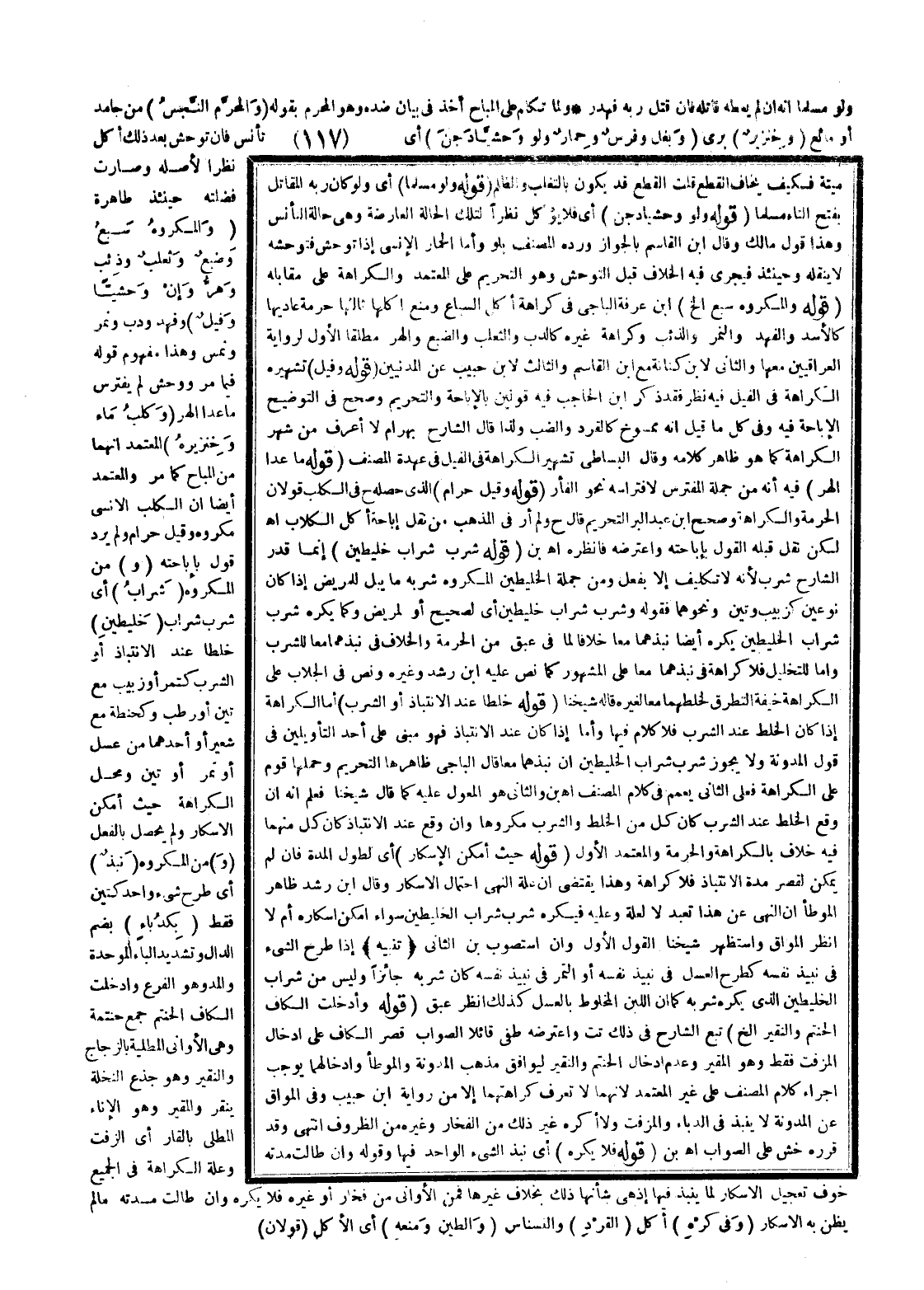 (وَ) مِنْ الْمَكْرُوهِ (شَرَابُ) أَيْ شُرْبُ شَرَابِ (خَلِيطَيْنِ) خُلِطَا عِنْدَ الِانْتِبَاذِ أَوْ الشُّرْبِ كَتَمْرٍ أَوْ زَبِيبٍ مَعَ تِينٍ أَوْ رُطَبٍ، وَكَحِنْطَةٍ مَعَ شَعِيرٍ أَوْ أَحَدُهُمَا مِنْ عَسَلٍ أَوْ تَمْرٍ أَوْ تِينٍ، وَمَحَلُّ الْكَرَاهَةِ حَيْثُ أَمْكَنَ الْإِسْكَارُ وَلَمْ يَحْصُلْ بِالْفِعْلِ.