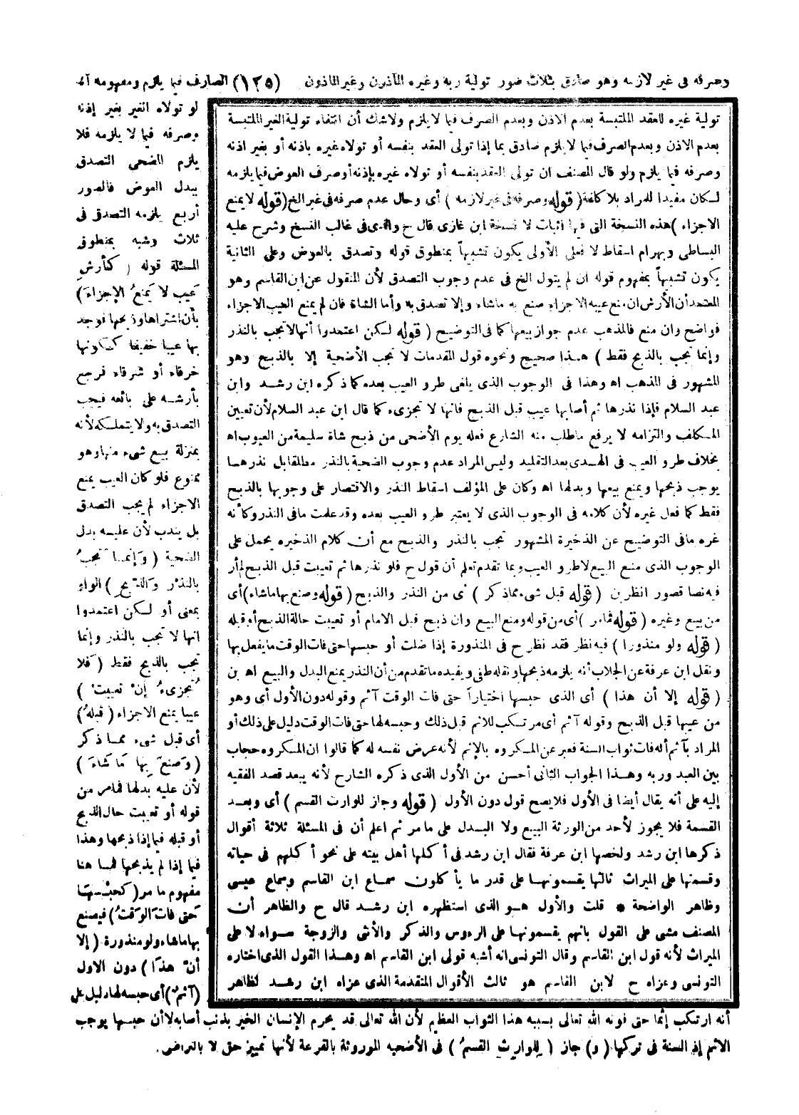 ـــــــــــــــــــــــــــــQتَوْلِيَةُ غَيْرِهِ لِلْعَقْدِ الْمُلْتَبِسَةِ بِعَدَمِ الْإِذْنِ وَبِعَدَمِ الصَّرْفِ فِيمَا لَا يَلْزَمُ، وَلَا شَكَّ أَنَّ انْتِفَاءَ تَوْلِيَةِ الْغَيْرِ الْمُتَلَبِّسَةِ بِعَدَمِ الْإِذْنِ وَبِعَدَمِ الصَّرْفِ فِيمَا لَا يَلْزَمُ صَادِقٌ بِمَا إذَا تَوَلَّى الْعَقْدَ بِنَفْسِهِ أَوْ تَوَلَّاهُ غَيْرُهُ بِإِذْنِهِ أَوْ بِغَيْرِ إذْنِهِ، وَصَرَفَهُ فِيمَا يَلْزَمُ، وَلَوْ قَالَ الْمُصَنِّفُ إنْ تَوَلَّى الْعَقْدَ بِنَفْسِهِ أَوْ تَوَلَّاهُ غَيْرُهُ بِإِذْنِهِ أَوْ صَرَفَ الْعِوَضَ فِيمَا يَلْزَمُهُ لَكَانَ مُفِيدًا لِلْمُرَادِ بِلَا كُلْفَةٍ (قَوْلُهُ: وَصَرَفَهُ فِي غَيْرِ لَازِمِهِ) أَيْ وَحَالُ عَدَمِ صَرْفِهِ فِي غَيْرِ إلَخْ (قَوْلُهُ: لَا يَمْنَعُ الْجَزَاءَ) هَذِهِ النُّسْخَةُ الَّتِي فِيهَا إثْبَاتٌ لَا نُسْخَةُ ابْنِ غَازِيٍّ قَالَ ح وَاَلَّذِي فِي غَالِبِ النُّسَخِ وَشَرَحَ عَلَيْهِ الْبِسَاطِيُّ وَبَهْرَامُ إسْقَاطُ لَا فَعَلَى الْأَوْلَى يَكُونُ تَشْبِيهًا بِمَنْطُوقِ قَوْلِهِ وَتَصَدَّقَ بِالْعِوَضِ، وَعَلَى الثَّانِيَةِ يَكُونُ تَشْبِيهًا بِمَفْهُومِ قَوْلِهِ إنْ لَمْ يَتَوَلَّ إلَخْ فِي عَدَمِ وُجُوبِ التَّصَدُّقِ؛ لِأَنَّ الْمَنْقُولَ عَنْ ابْنِ الْقَاسِمِ، وَهُوَ الْمُعْتَمَدُ أَنَّ الْأَرْشَ إنْ مَنَعَ عَيْبُهُ الْجَزَاءَ صَنَعَ بِهِ مَا شَاءَ، وَإِلَّا تَصَدَّقَ بِهِ، وَأَمَّا الشَّاةُ فَإِنْ لَمْ يَمْنَعْ الْعَيْبُ الْإِجْزَاءَ فَوَاضِحٌ، وَإِنْ مَنَعَ فَالْمَذْهَبُ عَدَمُ جَوَازِ بَيْعِهَا كَمَا فِي التَّوْضِيحِ.