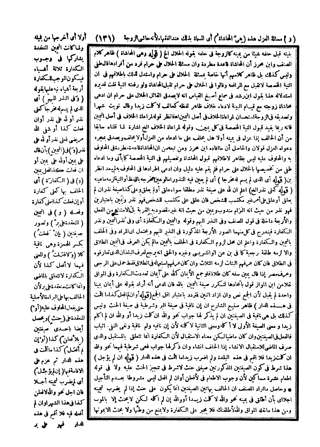 ـــــــــــــــــــــــــــــQبِنِيَّتِهِ قَبْلَ حَلِفِهِ شَيْئًا مِنْ يَمِينِهِ كَالزَّوْجَةِ فِي حَلِفِهِ بِقَوْلِهِ الْحَلَالُ إلَخْ (قَوْلُهُ: وَهِيَ الْمُحَاشَاةُ) ظَاهِرُ كَلَامِ الْمُصَنِّفِ وَابْنِ مُحْرِزٍ أَنَّ الْمُحَاشَاةَ قَاعِدَةٌ مُطَّرِدَةٌ، وَأَنَّ مَسْأَلَةَ الْحَلَالُ عَلَيَّ حَرَامٌ فَرْدٌ مِنْ أَفْرَادِهَا.