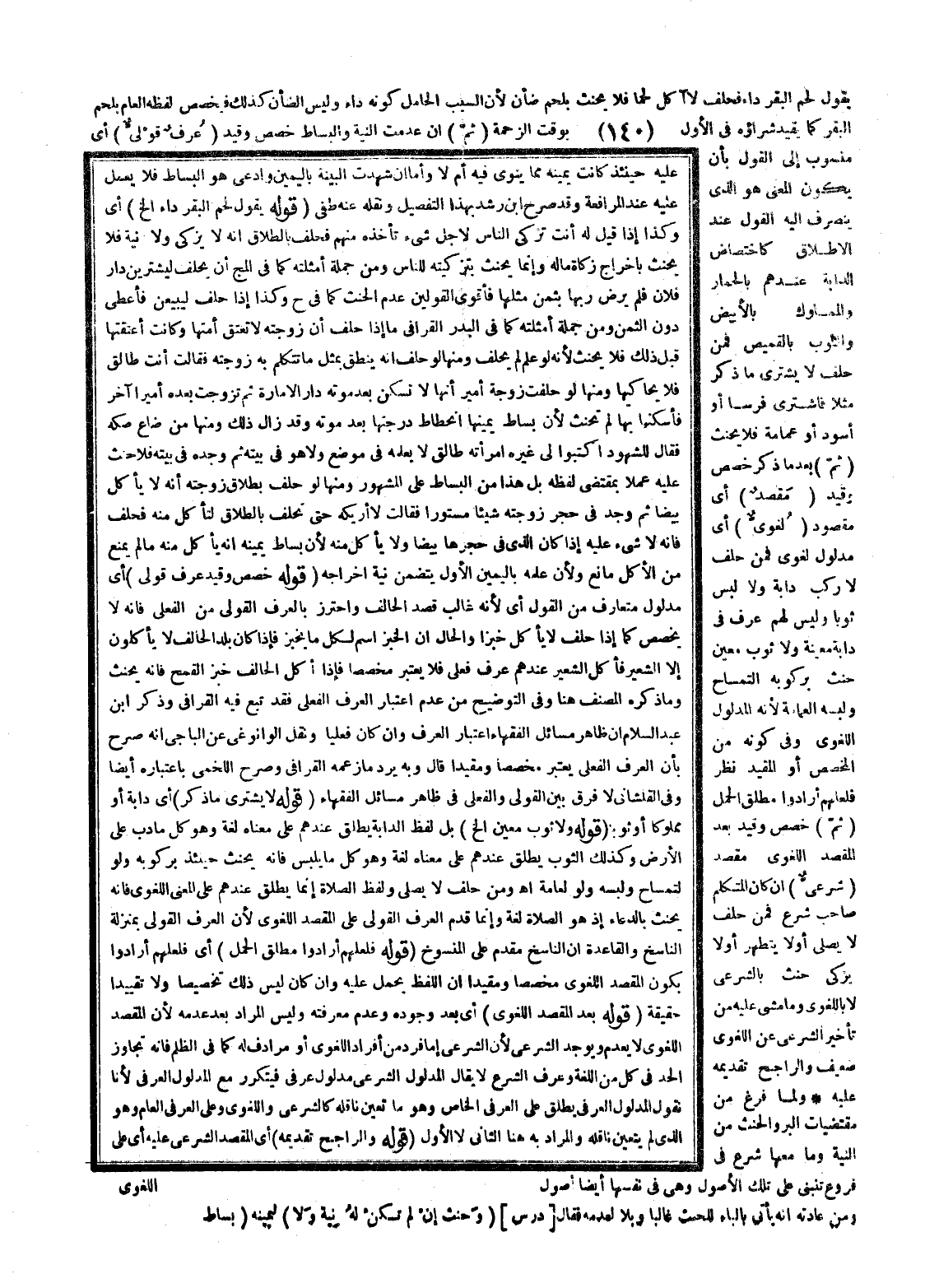 (ثُمَّ) خُصِّصَ، وَقُيِّدَ بَعْدَ الْمَقْصِدِ اللُّغَوِيِّ مَقْصِدٌ (شَرْعِيٌّ) إنْ كَانَ الْمُتَكَلِّمُ صَاحِبَ شَرْعٍ فَمَنْ حَلَفَ لَا يُصَلِّي أَوْ لَا يَتَطَهَّرُ أَوْ لَا يُزَكِّي حَنِثَ بِالشَّرْعِيِّ لَا بِاللُّغَوِيِّ، وَمَا مَشَى عَلَيْهِ مِنْ تَأْخِيرِ الشَّرْعِيِّ عَنْ اللُّغَوِيِّ ضَعِيفٌ وَالرَّاجِحُ تَقْدِيمُهُ عَلَيْهِ.