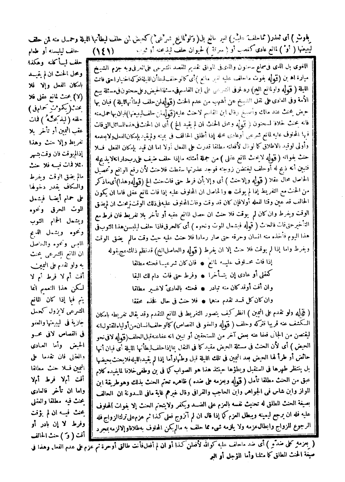 وَالْحَاصِلُ أَنَّ الْمَانِعَ الشَّرْعِيَّ يَحْنَثُ بِهِ، وَلَوْ تَقَدَّمَ عَلَى الْيَمِينِ أَقَّتَ أَمْ لَا فَرَّطَ أَمْ لَا لَكِنَّ هَذَا التَّعْمِيمَ إنَّمَا يَتِمُّ فِيمَا إذَا كَانَ الْمَانِعُ الشَّرْعِيُّ لَا يَزُولُ كَحَمْلِ جَارِيَةٍ فِي لَيَبِيعَنَّهَا وَالْعَفْوُ فِي الْقِصَاصِ لَا فِي نَحْوِ الْحَيْضِ، وَأَمَّا الْعَادِيُّ وَالْعَقْلِيُّ فَإِنْ تَقَدَّمَا عَلَى الْيَمِينِ فَلَا حِنْثَ مُطْلَقًا أَقَّتَ أَمْ لَا فَرَّطَ أَمْ لَا، وَأَمَّا إنْ تَأَخَّرَ فَالْعَادِيُّ يَحْنَثُ فِيهِ مُطْلَقًا، وَالْعَقْلِيُّ يَحْنَثُ فِيهِ إنْ لَمْ يُؤَقِّتْ، وَفَرَّطَ لَا إنْ بَادَرَ أَوْ أَقَّتَ.