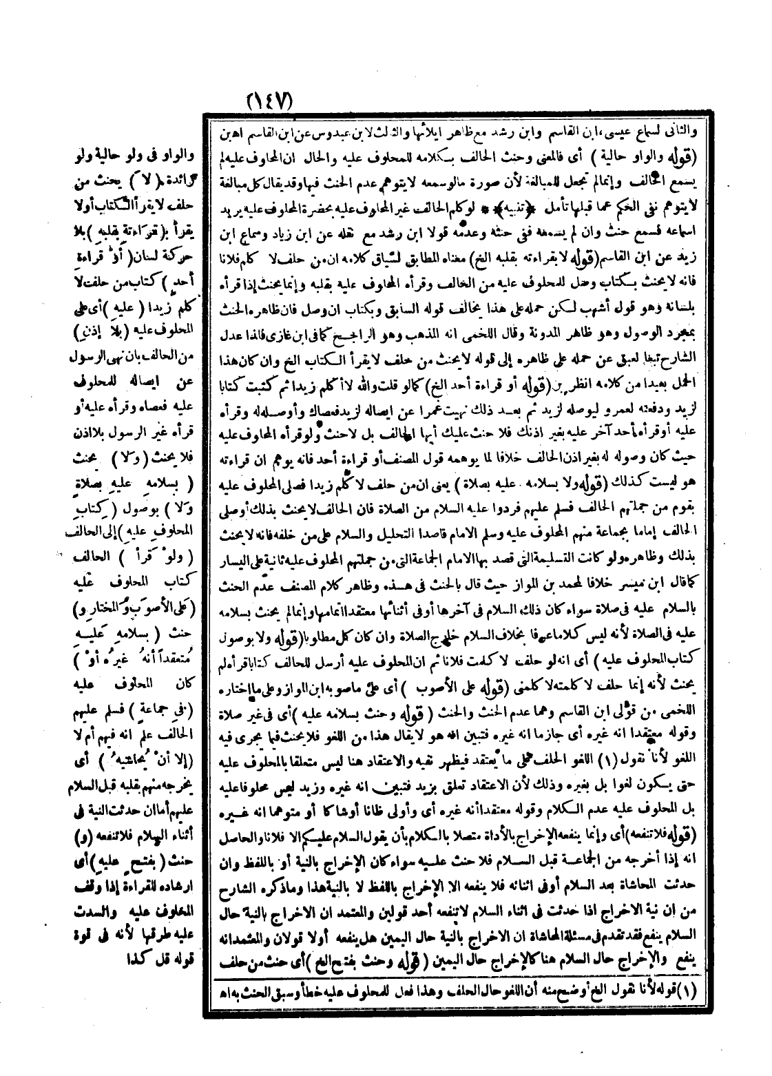 (لَا) يَحْنَثُ مَنْ حَلَفَ لَا يَقْرَأُ الْكِتَابَ أَوْ لَا يَقْرَأُ بِ (قِرَاءَتِهِ بِقَلْبِهِ) بِلَا حَرَكَةِ اللِّسَانِ (أَوْ قِرَاءَةِ أَحَدٍ) كِتَابَ مِنْ حَلَفَ لَا أُكَلِّمُ زَيْدًا (عَلَيْهِ) أَيْ عَلَى الْمَحْلُوفِ عَلَيْهِ (بِلَا إذْنٍ) مِنْ الْحَالِفِ بِأَنْ نَهَى الرَّسُولَ عَنْ إيصَالِهِ لِلْمَحْلُوفِ عَلَيْهِ فَعَصَاهُ، وَقَرَأَهُ عَلَيْهِ أَوْ قَرَأَهُ غَيْرُ الرَّسُولِ بِلَا إذْنٍ فَلَا يَحْنَثُ.