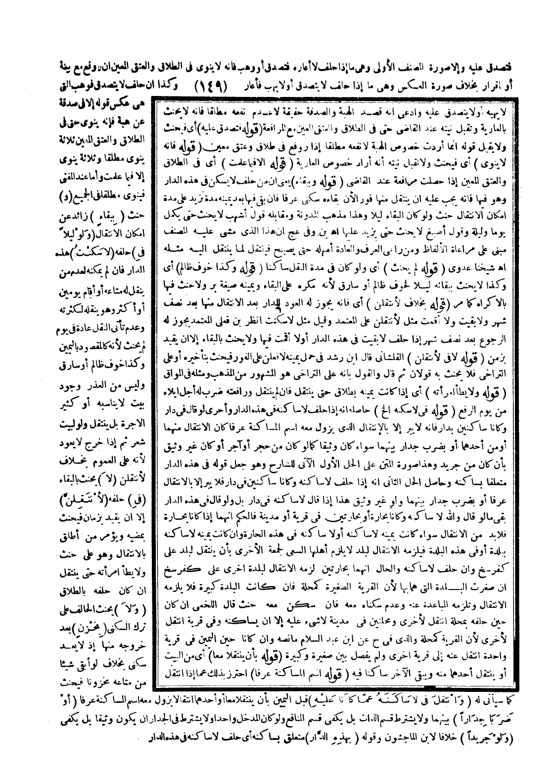 (قَوْلُهُ: فِي لَا أُسَاكِنُهُ إلَخْ) حَاصِلُهُ أَنَّهُ إذَا حَلَفَ لَا أُسَاكِنُهُ فِي هَذِهِ الدَّارِ، وَأَحْرَى لَوْ قَالَ فِي دَارٍ، وَكَانَا سَاكِنَيْنِ بِدَارٍ فَإِنَّهُ لَا يَبَرُّ إلَّا بِالِانْتِقَالِ الَّذِي يَزُولُ مَعَهُ اسْمُ الْمُسَاكَنَةِ عُرْفًا كَانَ الِانْتِقَالُ مِنْهُمَا أَوْ مِنْ أَحَدِهِمَا أَوْ بِضَرْبِ جِدَارٍ بَيْنَهُمَا سَوَاءٌ كَانَ وَثِيقًا كَمَا لَوْ كَانَ مِنْ حَجَرٍ أَوْ آجُرَّ أَوْ كَانَ غَيْرَ وَثِيقٍ بِأَنْ كَانَ مِنْ جَرِيدٍ، وَهَذَا صُورَةُ الْمَتْنِ عَلَى الْحَلِّ الْأَوَّلِ الْآتِي لِلشَّارِحِ، وَهُوَ جَعْلُ قَوْلِهِ فِي هَذِهِ الدَّارِ مُتَعَلِّقًا بِسَاكِنِهِ وَحَاصِلُ الْحَلِّ الثَّانِي أَنَّهُ إذَا حَلَفَ لَا سَاكَنَهُ، وَكَانَا سَاكِنَيْنِ فِي دَارٍ فَلَا يَبَرُّ إلَّا بِالِانْتِقَالِ عُرْفًا أَوْ بِضَرْبِ جِدَارٍ بَيْنَهُمَا، وَلَوْ غَيْرَ وَثِيقٍ هَذَا إذَا قَالَ لَا سَاكَنَهُ فِي دَارٍ بَلْ، وَلَوْ قَالَ فِي هَذِهِ الدَّارِ بَقِيَ مَا لَوْ قَالَ وَاَللَّهِ لَا سَاكَنَهُ، وَكَانَا بِحَارَةٍ أَوْ بِحَارَتَيْنِ فِي قَرْيَةٍ أَوْ مَدِينَةٍ فَالْحُكْمُ أَنَّهُمَا إذَا كَانَا بِحَارَةٍ فَلَا بُدَّ مِنْ الِانْتِقَالِ سَوَاءٌ كَانَتْ يَمِينُهُ لَا سَاكَنَهُ أَوْ لَا سَاكَنَهُ فِي هَذِهِ الْحَارَةِ، وَإِنْ كَانَتْ يَمِينُهُ لَا سَاكَنَهُ بِبَلْدَةٍ أَوْ فِي هَذِهِ الْبَلْدَةِ فَيَلْزَمُهُ الِانْتِقَالُ لِبَلَدٍ لَا يَلْزَمُ أَهْلَهَا السَّعْيُ لِجُمُعَةٍ الْأُخْرَى بِأَنْ يَنْتَقِلَ لِبَلَدٍ عَلَى كَفَرْسَخٍ، وَإِنْ حَلَفَ لَا سَاكَنَهُ وَالْحَالُ أَنَّهُمَا بِحَارَتَيْنِ لَزِمَهُ الِانْتِقَالُ لِبَلْدَةٍ أُخْرَى عَلَى كَفَرْسَخٍ إنْ صَغُرَتْ الْبَلْدَةُ الَّتِي هُمَا بِهَا؛ لِأَنَّ الْقَرْيَةَ الصَّغِيرَةَ كَمَحَلَّةِ فَإِنْ كَانَتْ الْبَلْدَةُ كَبِيرَةً فَلَا يَلْزَمُهُ الِانْتِقَالُ وَتَلْزَمُهُ الْمُبَاعَدَةُ عَنْهُ، وَعَدَمُ سُكْنَاهُ مَعَهُ فَإِنْ سَكَنَ مَعَهُ حَنِثَ قَالَ اللَّخْمِيُّ إنْ كَانَ حِينَ حَلِفِهِ بِمَحَلَّةٍ انْتَقَلَ لِأُخْرَى، وَمَحَلَّتَيْنِ فِي مَدِينَةٍ لَا شَيْءَ عَلَيْهِ إلَّا أَنْ يُسَاكِنَهُ، وَفِي قَرْيَةٍ انْتَقَلَ لِأُخْرَى؛ لِأَنَّ الْقَرْيَةَ كَمَحَلَّةٍ وَاَلَّذِي فِي ح عَنْ ابْنِ عَبْدِ السَّلَامِ مَا نَصُّهُ، وَإِنْ كَانَا حِينَ الْيَمِينِ فِي قَرْيَةٍ وَاحِدَةٍ انْتَقَلَ عَنْهُ إلَى قَرْيَةٍ أُخْرَى، وَلَمْ يُفَصِّلْ بَيْنَ صَغِيرَةٍ وَكَبِيرَةٍ (قَوْلُهُ بِأَنْ يَنْتَقِلَا مَعًا) أَيْ مِنْ الْبَيْتِ أَوْ يَنْتَقِلُ أَحَدُهُمَا مِنْهُ وَيَبْقَى الْآخَرُ سَاكِنًا فِيهِ.