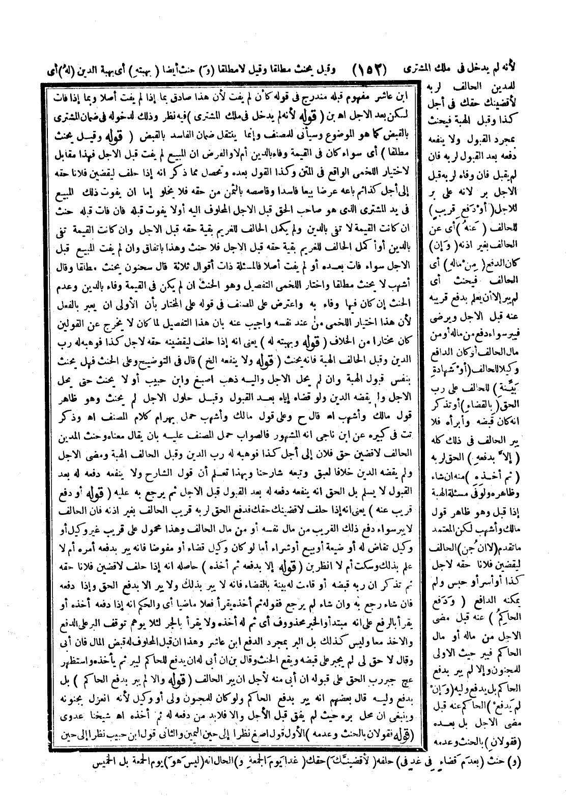 ـــــــــــــــــــــــــــــQابْنُ عَاشِرٍ مَفْهُومُ قَبْلَهُ مُنْدَرِجٌ فِي قَوْلِهِ كَأَنْ لَمْ يَفُتْ؛ لِأَنَّ هَذَا صَادِقٌ بِمَا إذَا لَمْ يَفُتْ أَصْلًا وَبِمَا إذَا فَاتَ لَكِنْ بَعْدَ الْأَجَلِ. اهـ. بْن (قَوْلُهُ: لِأَنَّهُ لَمْ يَدْخُلْ فِي مِلْكِ الْمُشْتَرِي) فِيهِ نَظَرٌ، وَذَلِكَ لِدُخُولِهِ فِي ضَمَانِ الْمُشْتَرِي بِالْقَبْضِ كَمَا هُوَ الْمَوْضُوعُ وَسَيَأْتِي لِلْمُصَنِّفِ، وَإِنَّمَا يَنْتَقِلُ ضَمَانُ الْفَاسِدِ بِالْقَبْضِ (قَوْلُهُ: وَقِيلَ يَحْنَثُ مُطْلَقًا) أَيْ سَوَاءٌ كَانَ فِي الْقِيمَةِ وَفَاءٌ بِالدَّيْنِ أَمْ لَا وَالْفَرْضُ أَنَّ الْمَبِيعَ لَمْ يَفُتْ قَبْلَ الْأَجَلِ فَهَذَا مُقَابِلٌ لِاخْتِيَارِ اللَّخْمِيِّ الْوَاقِعِ فِي الْمَتْنِ، وَكَذَا الْقَوْلُ بَعْدَهُ وَتَحَصَّلَ مِمَّا ذُكِرَ أَنَّهُ إذَا حَلَفَ لَيَقْضِيَنَّ فُلَانًا حَقَّهُ إلَى أَجَلِ كَذَا ثُمَّ بَاعَهُ عَرَضًا بَيْعًا فَاسِدًا، وَقَاصَصَهُ بِالثَّمَنِ مِنْ حَقِّهِ فَلَا يَخْلُو إمَّا أَنْ يَفُوتَ ذَلِكَ الْمَبِيعُ فِي يَدِ الْمُشْتَرِي الَّذِي هُوَ صَاحِبُ الْحَقِّ قَبْلَ الْأَجَلِ الْمَحْلُوفِ إلَيْهِ أَوْ لَا يَفُوتُ قَبْلَهُ فَإِنْ فَاتَ قَبْلَهُ حَنِثَ إنْ كَانَتْ الْقِيمَةُ لَا تَفِي بِالدَّيْنِ، وَلَمْ يُكَمِّلْ الْحَالِفُ لِلْغَرِيمِ بَقِيَّةَ حَقِّهِ قَبْلَ الْأَجَلِ، وَإِنْ كَانَتْ الْقِيمَةُ لَا تَفِي بِالدَّيْنِ وَلَمْ يُكْمِلْ الْحَالِفُ لِلْغَرِيمِ بَقِيَّةَ حَقِّهِ قَبْلَ الْأَجَلِ وَإِنْ كَانَتْ الْقِيمَةُ تَفِي بِالدَّيْنِ أَوْ أَكْمَلَ الْحَالِفُ لِلْغَرِيمِ بَقِيَّةَ حَقِّهِ قَبْلَ الْأَجَلِ فَلَا حِنْثَ، وَهَذَا بِاتِّفَاقٍ، وَإِنْ لَمْ يَفُتْ الْمَبِيعُ قَبْلَ الْأَجَلِ، سَوَاءٌ فَاتَ بَعْدَهُ أَوْ لَمْ يَفُتْ أَصْلًا فَالْمَسْأَلَةُ ذَاتُ أَقْوَالٍ ثَلَاثَةٍ قَالَ سَحْنُونٌ يَحْنَثُ مُطْلَقًا، وَقَالَ أَشْهَبُ لَا يَحْنَثُ مُطْلَقًا وَاخْتَارَ اللَّخْمِيُّ التَّفْصِيلَ، وَهُوَ الْحِنْثُ إنْ لَمْ يَكُنْ فِي الْقِيمَةِ وَفَاءٌ بِالدَّيْنِ، وَعَدَمُ الْحِنْثِ إنْ كَانَ فِيهَا وَفَاءٌ بِهِ، وَاعْتَرَضَ عَلَى الْمُصَنِّفِ فِي قَوْلِهِ عَلَى الْمُخْتَارِ بِأَنَّ الْأَوْلَى أَنْ يُعَبِّرَ بِالْفِعْلِ؛ لِأَنَّ هَذَا اخْتِيَارُ اللَّخْمِيِّ مِنْ عِنْدِ نَفْسِهِ، وَأُجِيبُ عَنْهُ بِأَنَّ هَذَا التَّفْصِيلَ لَمَّا كَانَ لَا يَخْرُجُ عَنْ الْقَوْلَيْنِ كَانَ مُخْتَارًا مِنْ الْخِلَافِ.