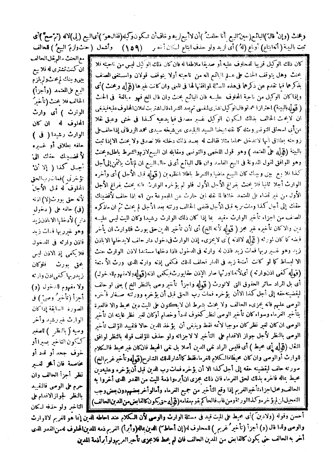 (قَوْلُهُ: بِالْبَيِّنَةِ) احْتِرَازًا عَمَّا لَوْ قَالَ الْوَكِيلُ أَشْتَرِي لِنَفْسِي ثُمَّ بَعْدَ الشِّرَاءِ قَالَ اشْتَرَيْتُ لِفُلَانٍ الْمَحْلُوفِ عَلَيْهِ فَيَنْبَغِي أَنْ لَا يَحْنَثَ الْحَالِفُ بِذَلِكَ لِكَوْنِ الْوَكِيلِ غَيْرَ مُصَدَّقٍ فِيمَا يَدَّعِيهِ كَذَا فِي خش وعبق نَقْلًا عَنْ أَبِي إِسْحَاقَ التُونُسِيِّ، وَمِثْلُهُ كَمَا نَقَلَهُ شَيْخُنَا السَّيِّدُ الْبُلَيْدِيُّ عَنْ شَيْخِهِ سَيِّدِي مُحَمَّدٍ الزَّرْقَانِيِّ إذَا حَلَفَ عَلَى زَوْجَتِهِ بِطَلَاقٍ أَنَّهَا لَا تَدْخُلُ حَمَّامًا مَثَلًا فَقَالَتْ لَهُ بَعْدَ ذَلِكَ دَخَلْتُهُ فَلَا تُصَدَّقُ، وَلَا يَحْنَثُ إلَّا إذَا ثَبَتَ بِالْبَيِّنَةِ (قَوْلُهُ: عَلَى الْمُعْتَمَدِ) ، وَهُوَ قَوْلُ اللَّخْمِيِّ وَالتُّونُسِيِّ، وَمُقَابِلُهُ أَنَّ الْبَيْعَ لَازِمٌ وَالشَّرْطَ بَاطِلٌ وَيَحْنَثُ، وَهُوَ الْمُوَافِقُ لِقَوْلِ الْمُدَوَّنَةِ فِي الْبَيْعِ الْفَاسِدِ، وَإِنْ قَالَ الْبَائِعُ أَيْ فِي حَالِ الْبَيْعِ إنْ لَمْ تَأْتِ بِالثَّمَنِ إلَى أَجَلِ كَذَا فَلَا بَيْعَ بَيْنِي وَبَيْنَك كَانَ الْبَيْعُ مَاضِيًا وَالشَّرْطُ بَاطِلًا اُنْظُرْ بْن.