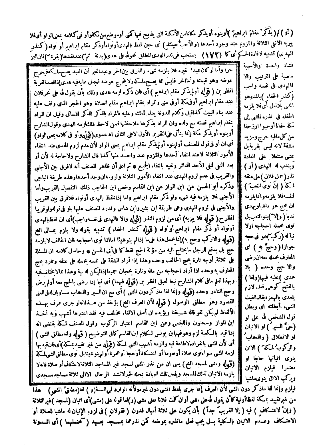 ـــــــــــــــــــــــــــــQحُرًّا، وَأَمَّا لَوْ كَانَ عَبْدًا لِغَيْرِهِ فَلَا يَلْزَمُهُ شَيْءٌ وَالْفَرْقُ بَيْنَ الْحُرِّ وَعَبْدِ الْغَيْرِ أَنَّ الْعَبْدَ يَصِحُّ مِلْكُهُ فَيُخْرِجُ عِوَضَهُ وَهُوَ قِيمَتُهُ، وَأَمَّا الْحُرُّ فَلَيْسَ مِمَّا يَصِحُّ مِلْكُهُ، وَلَا يُخْرِجُ عِوَضَهُ فَجَعَلَ عَلَيْهِ فِيهِ هَدْيٌ إذَا قَصَدَ الْقُرْبَةَ. اُنْظُرْ بْن (قَوْلُهُ: أَوْ لَمْ يَذْكُرْ مَقَامَ إبْرَاهِيمَ) أَيْ فَإِنْ ذَكَرَهُ لَزِمَهُ هَدْيٌ، وَذَلِكَ بِأَنْ يَقُولُ لِلَّهِ عَلَيَّ نَحْرُ فُلَانٍ عِنْدَ مَقَامِ إبْرَاهِيمَ أَوْ فِي مَكَّةَ أَوْ فِي مِنًى وَالْمُرَادُ بِمَقَامِ إبْرَاهِيمَ مَقَامُ الصَّلَاةِ، وَهُوَ الْحَجَرُ الَّذِي، وَقَفَ عَلَيْهِ عِنْدَ بِنَاءِ الْبَيْتِ، كَذَا قِيلَ، وَكَلَامُ الْمُدَوَّنَةِ يَدُلُّ لِذَلِكَ وَعَلَيْهِ فَالْمُرَادُ بِالذِّكْرِ الذِّكْرُ اللِّسَانِيُّ، وَقِيلَ إنَّ الْمُرَادَ بِمَقَامِ إبْرَاهِيمَ قِصَّتُهُ مَعَ وَلَدِهِ، وَأَنَّ الْمُرَادَ بِذِكْرِهَا مُلَاحَظَتُهَا فَمَنْ لَاحَظَ ذَلِكَ لَزِمَهُ الْهَدْيُ، وَقَوْلُ الشَّارِحِ أَوْ يَنْوِهِ أَوْ يَذْكُرْ مَكَّةَ إنَّمَا يَتَأَتَّى عَلَى التَّقْرِيرِ الْأَوَّلِ لَا عَلَى الثَّانِي. اهـ عَدَوِيٌّ.