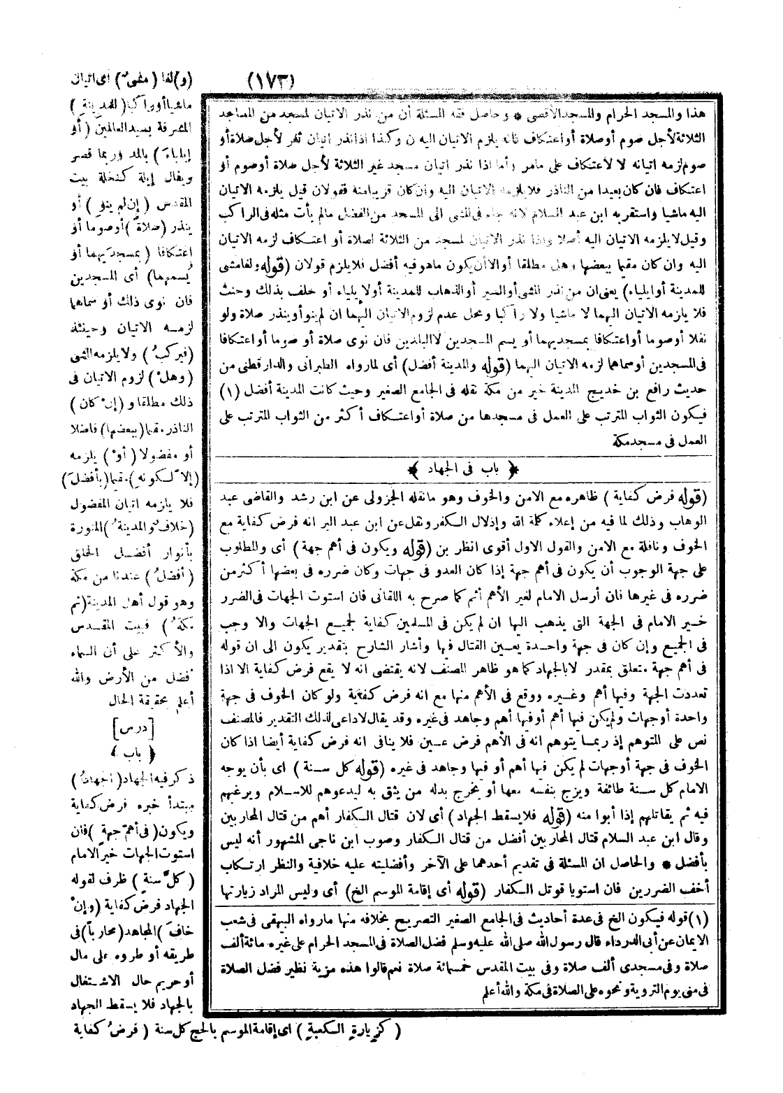 دَرْسٌ (بَابٌ) ذَكَرَ فِيهِ الْجِهَادَ (الْجِهَادُ) مُبْتَدَأٌ خَبَرُهُ فَرْضُ كِفَايَةٍ وَيَكُونُ (فِي أَهَمِّ جِهَةٍ) فَإِنْ اسْتَوَتْ الْجِهَات خُيِّرَ الْإِمَامُ (كُلَّ سَنَةٍ) ظَرْفٌ لِقَوْلِهِ الْجِهَادُ فَرْضُ كِفَايَةٍ (وَإِنْ) (خَافَ) الْمُجَاهِدُ (مُحَارِبًا) فِي طَرِيقِهِ أَوْ طَرْؤُهُ عَلَى مَالٍ أَوْ حَرِيمٍ حَالَ الِاشْتِغَالِ بِالْجِهَادِ فَلَا يَسْقُطُ الْجِهَادُ (كَزِيَارَةِ الْكَعْبَةِ) أَيْ إقَامَةِ الْمَوْسِمِ بِالْحَجِّ كُلَّ سَنَةٍ (فَرْضُ كِفَايَةٍ)