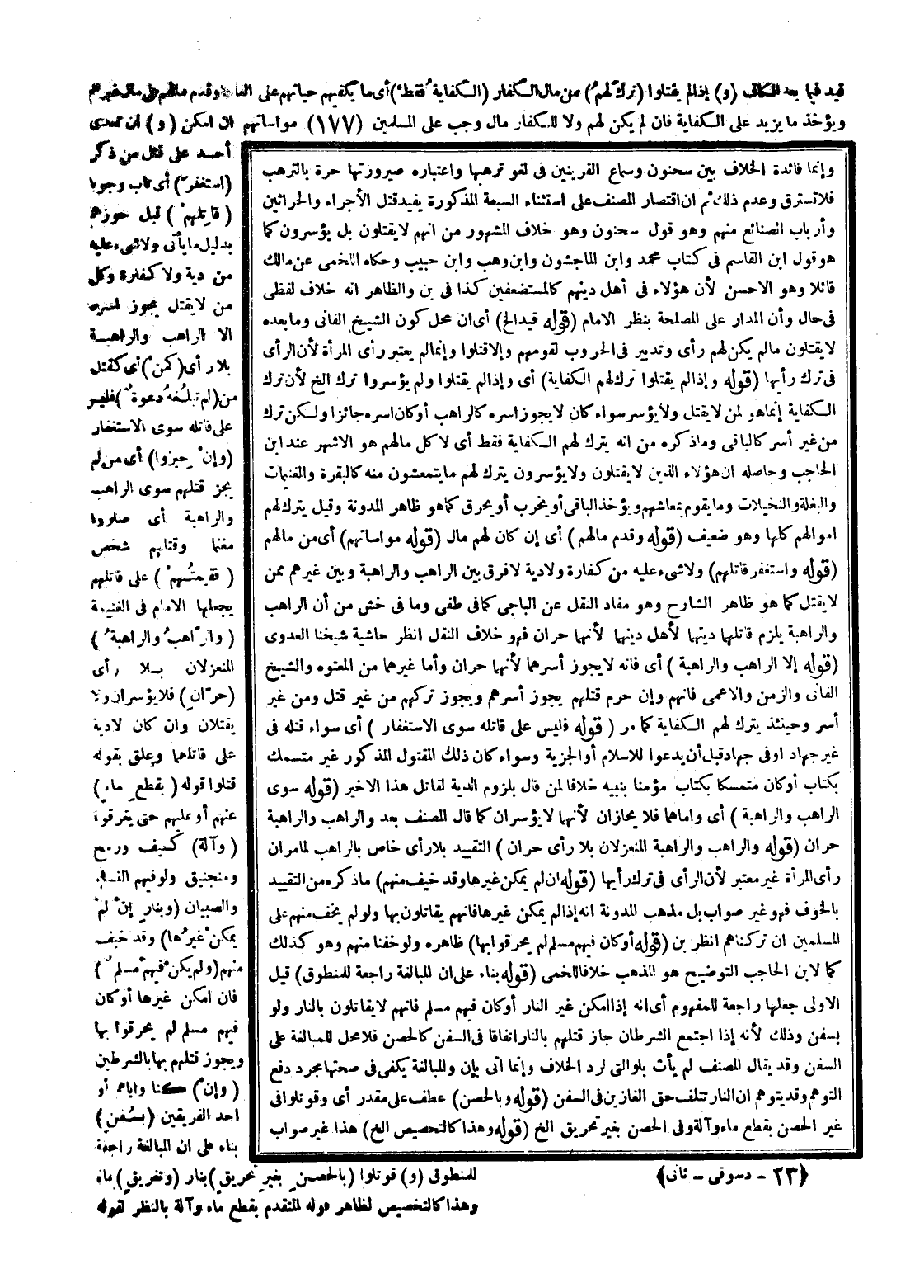 ـــــــــــــــــــــــــــــQوَإِنَّمَا فَائِدَةُ الْخِلَافِ بَيْنَ سَحْنُونٍ وَسَمَاعِ الْقَرِينَيْنِ فِي لَغْوِ تَرَهُّبِهَا وَاعْتِبَارِهِ صَيْرُورَتَهَا حُرَّةً بِالتَّرَهُّبِ فَلَا تُسْتَرَقُّ، وَعَدَمُ ذَلِكَ ثُمَّ إنَّ اقْتِصَارَ الْمُصَنِّفِ عَلَى اسْتِثْنَاءِ السَّبْعَةِ الْمَذْكُورَةِ يُفِيدُ قَتْلَ الْأُجَرَاءِ وَالْحَرَّاثِينَ وَأَرْبَابِ الصَّنَائِعِ مِنْهُمْ وَهُوَ قَوْلُ سَحْنُونٍ، وَهُوَ خِلَافُ الْمَشْهُورِ مِنْ أَنَّهُمْ لَا يُقْتَلُونَ بَلْ يُؤْسَرُونَ كَمَا هُوَ قَوْلُ ابْنِ الْقَاسِمِ فِي كِتَابِ مُحَمَّدٍ وَابْنِ الْمَاجِشَونِ وَابْنِ وَهْبٍ وَابْنِ حَبِيبٍ وَحَكَاهُ اللَّخْمِيُّ عَنْ مَالِكٍ قَائِلًا وَهُوَ الْأَحْسَنُ؛ لِأَنَّ هَؤُلَاءِ فِي أَهْلِ دِينِهِمْ كَالْمُسْتَضْعَفِينَ كَذَا فِي بْن وَالظَّاهِرُ أَنَّهُ خِلَافٌ لَفْظِيٌّ فِي حَالٍ، وَأَنَّ الْمَدَارَ عَلَى الْمَصْلَحَةِ بِنَظَرِ الْإِمَامِ (قَوْلُهُ: قَيَّدَ إلَخْ) أَيْ أَنَّ مَحَلَّ كَوْنِ الشَّيْخِ الْفَانِي، وَمَا بَعْدَهُ لَا يُقْتَلُونَ مَا لَمْ يَكُنْ لَهُمْ رَأْيٌ وَتَدْبِيرٌ فِي الْحُرُوبِ لِقَوْمِهِمْ، وَإِلَّا قُتِلُوا وَإِنَّمَا لَمْ يُعْتَبَرُ رَأْيُ الْمَرْأَةِ؛ لِأَنَّ الرَّأْيَ فِي تَرْكِ رَأْيِهَا (قَوْلُهُ: وَإِذَا لَمْ يُقْتَلُوا تُرِكَ لَهُمْ الْكِفَايَةُ) أَيْ، وَإِذَا لَمْ يُقْتَلُوا، وَلَمْ يُؤْسَرُوا تَرَكَ إلَخْ؛ لِأَنَّ تَرْكَ الْكِفَايَةِ إنَّمَا هُوَ لِمَنْ لَا يُقْتَلُ، وَلَا يُؤْسَرُ سَوَاءٌ كَانَ لَا يَجُوزُ أَسْرُهُ كَالرَّاهِبِ أَوْ كَانَ أَسْرُهُ جَائِزًا، وَلَكِنْ تُرِكَ مِنْ غَيْرِ أَسْرٍ كَالْبَاقِي، وَمَا ذَكَرَهُ مِنْ أَنَّهُ يَتْرُكُ لَهُمْ الْكِفَايَةَ فَقَطْ أَيْ لَا كُلَّ مَا لَهُمْ هُوَ الْأَشْهَرُ عِنْدَ ابْنِ الْحَاجِبِ وَحَاصِلُهُ أَنَّ هَؤُلَاءِ الَّذِينَ لَا يُقْتَلُونَ، وَلَا يُؤْسَرُونَ يُتْرَكُ لَهُمْ مَا يَتَمَعْيَشُونَ مِنْهُ كَالْبَقَرَةِ وَالْغُنَيْمَاتِ وَالْبَغْلَةِ وَالنُّخَيْلَاتِ وَمَا يَقُومُ بِمَعَاشِهِمْ، وَيُؤْخَذُ الْبَاقِي أَوْ يُخَرَّبُ أَوْ يُحْرَقُ كَمَا هُوَ ظَاهِرُ الْمُدَوَّنَةِ، وَقِيلَ يُتْرَكُ لَهُمْ أَمْوَالُهُمْ كُلُّهَا، وَهُوَ ضَعِيفٌ (قَوْلُهُ: وَقُدِّمَ مَالُهُمْ) أَيْ إنْ كَانَ لَهُمْ مَالٌ (قَوْلُهُ: مُوَاسَاتُهُمْ) أَيْ مِنْ مَالِهِمْ (قَوْلُهُ: وَاسْتَغْفَرَ قَاتِلُهُمْ) وَلَا شَيْءَ عَلَيْهِ مِنْ كَفَّارَةٍ وَلَا دِيَةٍ لَا فَرْقَ بَيْنَ الرَّاهِبِ وَالرَّاهِبَةِ وَبَيْنَ غَيْرِهِمْ مِمَّنْ لَا يُقْتَلُ كَمَا هُوَ ظَاهِرُ الشَّارِحِ وَهُوَ مُفَادُ النَّقْلِ عَنْ الْبَاجِيَّ كَمَا فِي طفى وَمَا فِي خش مِنْ أَنَّ الرَّاهِبَ وَالرَّاهِبَةَ يَلْزَمُ قَاتِلَهُمَا دِيَتُهُمَا لِأَهْلِ دِينِهِمَا؛ لِأَنَّهُمَا حُرَّانِ فَهُوَ خِلَافُ النَّقْلِ، اُنْظُرْ حَاشِيَةَ شَيْخِنَا الْعَدَوِيِّ.