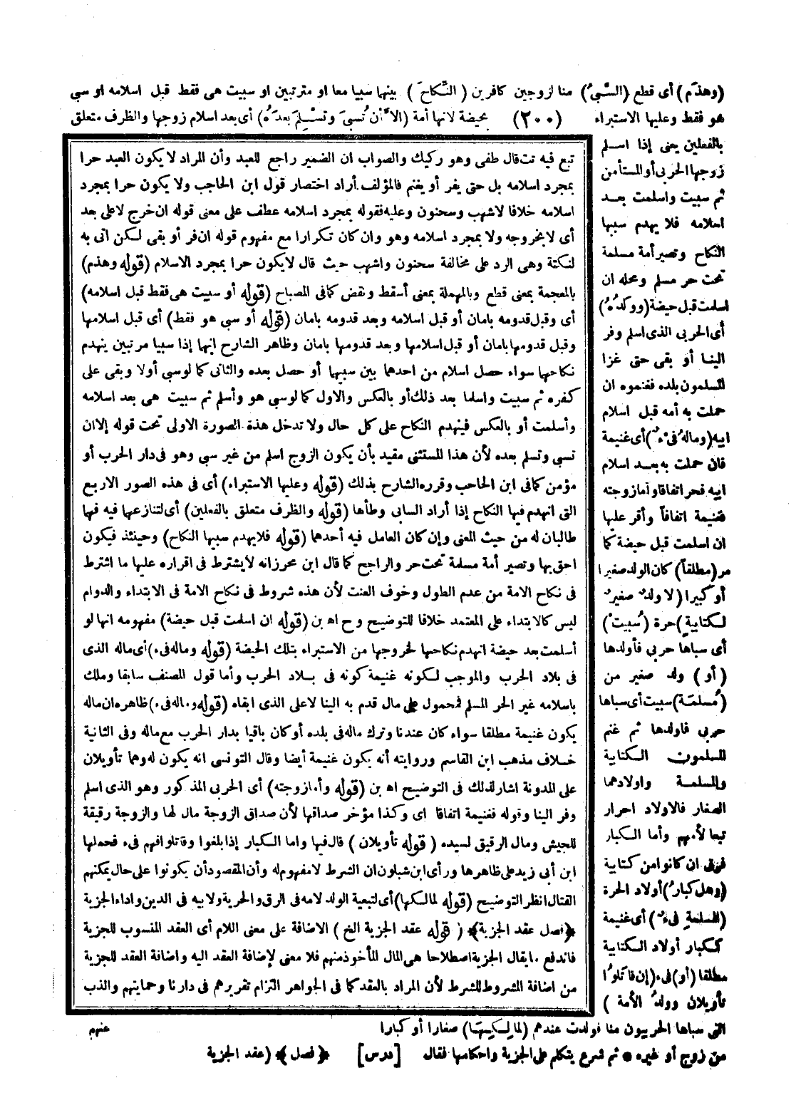 (وَهَذَمَ) أَيْ قَطَعَ (السَّبْيُ) مِنَّا لِزَوْجَيْنِ كَافِرَيْنِ (النِّكَاحَ) بَيْنَهُمَا سُبِيَا مَعًا أَوْ مُتَرَتِّبَيْنِ أَوْ سُبِيَتْ هِيَ فَقَطْ قَبْلَ إسْلَامِهِ أَوْ سُبِيَ هُوَ فَقَطْ، وَعَلَيْهَا الِاسْتِبْرَاءُ بِحَيْضَةٍ؛ لِأَنَّهَا أَمَةٌ (إلَّا أَنْ تُسْبَى وَتُسْلِمَ بَعْدَهُ) أَيْ بَعْدَ إسْلَامِ زَوْجِهَا وَالظَّرْفُ مُتَعَلِّقٌ بِالْفِعْلَيْنِ يَعْنِي إذَا أَسْلَمَ زَوْجُهَا الْحَرْبِيُّ أَوْ الْمُسْتَأْمِنُ ثُمَّ سُبِيَتْ وَأَسْلَمَتْ بَعْدَ إسْلَامِهِ فَلَا يَهْذِمُ سَبْيُهَا النِّكَاحَ وَتَصِيرُ أَمَةً مُسْلِمَةً تَحْتَ حُرٍّ مُسْلِمٍ، وَمَحَلُّهُ إنْ أَسْلَمَتْ قَبْلَ حَيْضَةٍ (وَوَلَدُهُ) أَيْ الْحَرْبِيُّ الَّذِي أَسْلَمَ وَفَرَّ إلَيْنَا أَوْ بَقِيَ حَتَّى غَزَا الْمُسْلِمُونَ بَلَدَهُ فَغَنِمُوهُ إنْ حَمَلَتْ بِهِ أُمُّهُ قَبْلَ إسْلَامِ أَبِيهِ (وَمَالُهُ فَيْءٌ) أَيْ غَنِيمَةٌ فَإِنْ حَمَلَتْ بِهِ بَعْدَ إسْلَامِ أَبِيهِ فَحُرٌّ اتِّفَاقًا، وَأَمَّا زَوْجَتُهُ فَغَنِيمَةٌ اتِّفَاقًا، وَأُقِرَّ عَلَيْهَا إنْ أَسْلَمَتْ قَبْلَ حَيْضَةٍ كَمَا مَرَّ (مُطْلَقًا) كَانَ الْوَلَدُ صَغِيرًا أَوْ كَبِيرًا (لَا وَلَدٌ صَغِيرٌ لِكِتَابِيَّةٍ) حُرَّةٍ (سُبِيَتْ) أَيْ سَبَاهَا حَرْبِيٌّ فَأَوْلَدَهَا (أَوْ) وَلَدٌ صَغِيرُ مِنْ (مُسْلِمَةٍ) سُبِيَتْ أَيْ سَبَاهَا حَرْبِيٌّ فَأَوْلَدَهَا ثُمَّ غَنِمَ الْمُسْلِمُونَ الْكِتَابِيَّةَ وَالْمُسْلِمَةَ وَأَوْلَادَهُمَا الصِّغَارَ فَالْأَوْلَادُ أَحْرَارٌ تَبَعًا لِأُمِّهِمْ، وَأَمَّا الْكِبَارُ فَرِقٌّ إنْ كَانُوا مِنْ كِتَابِيَّةٍ (وَهَلْ) (كِبَارُ) أَوْلَادِ الْحُرَّةِ (الْمُسْلِمَةِ) (فَيْءٌ) أَيْ غَنِيمَةٌ كَكِبَارِ أَوْلَادِ الْكِتَابِيَّةِ مُطْلَقًا (أَوْ) فَيْءٌ (إنْ قَاتَلُوا تَأْوِيلَانِ) (وَوَلَدُ الْأَمَةِ) الَّتِي سَبَاهَا الْحَرْبِيُّونَ مِنَّا فَوَلَدَتْ عِنْدَهُمْ (لِمَالِكِهَا) صِغَارًا أَوْ كِبَارًا مِنْ زَوْجٍ أَوْ غَيْرِهِ.