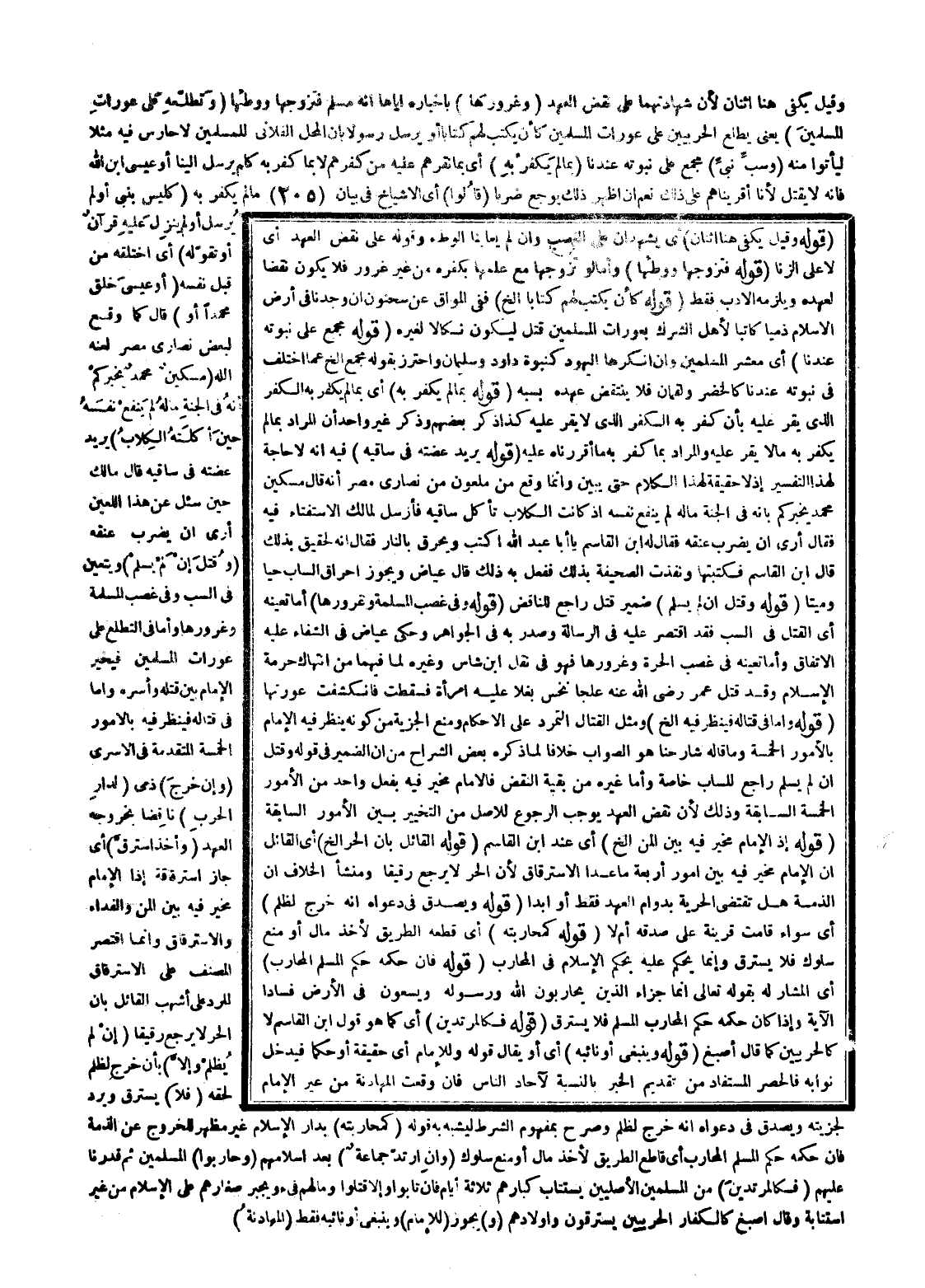 ـــــــــــــــــــــــــــــQقَوْلُهُ: وَقِيلَ يَكْفِي هُنَا اثْنَانِ) أَيْ يَشْهَدَانِ عَلَى الْغَصْبِ، وَإِنْ لَمْ يُعَايِنَا الْوَطْءَ، وَقَوْلُهُ: عَلَى نَقْضِ الْعَهْدِ أَيْ لَا عَلَى الزِّنَا (قَوْلُهُ: فَتَزَوَّجَهَا وَوَطِئَهَا) وَأَمَّا لَوْ تَزَوَّجَهَا مَعَ عِلْمِهَا بِكُفْرِهِ مِنْ غَيْرِ غُرُورٍ فَلَا يَكُونَ نَقْضًا لِعَهْدِهِ، وَيَلْزَمُهُ الْأَدَبُ فَقَطْ (قَوْلُهُ: كَأَنْ يَكْتُبَ لَهُمْ كِتَابًا إلَخْ) فَفِي الْمَوَّاقِ عَنْ سَحْنُونٍ إنْ وَجَدْنَا فِي أَرْضِ الْإِسْلَامِ ذِمِّيًّا كَاتِبًا لِأَهْلِ الشِّرْكِ بِعَوْرَاتِ الْمُسْلِمِينَ قُتِلَ لِيَكُونَ نَكَالًا لِغَيْرِهِ (قَوْلُهُ: مُجْمَعٌ عَلَى نُبُوَّتِهِ عِنْدَنَا) أَيْ مَعْشَرِ الْمُسْلِمِينَ، وَإِنْ أَنْكَرَهَا الْيَهُودُ كَنُبُوَّةِ دَاوُد وَسُلَيْمَانَ وَاحْتَرَزَ بِقَوْلِهِ مَجْمَعٌ إلَخْ عَمَّا اُخْتُلِفَ فِي نُبُوَّتِهِ عِنْدَنَا كَالْخَضِرِ وَلُقْمَانَ فَلَا يُنْتَقَضُ عَهْدُهُ بِسَبِّهِ (قَوْلُهُ: بِمَا لَمْ يَكْفُرْ بِهِ) أَيْ بِمَا لَمْ يَكْفُرْ بِهِ الْكُفْرَ الَّذِي يُقَرُّ عَلَيْهِ بِأَنْ كَفَرَ بِهِ الْكُفْرَ الَّذِي لَا يُقَرُّ عَلَيْهِ كَذَا ذَكَرَ بَعْضُهُمْ وَذَكَرَ غَيْرُ وَاحِدٍ أَنَّ الْمُرَادَ بِمَا لَمْ يَكْفُرْ بِهِ مَا لَا يُقَرُّ عَلَيْهِ وَالْمُرَادُ بِمَا كَفَرَ بِهِ مَا أَقْرَرْنَاهُ عَلَيْهِ (قَوْلُهُ: يُرِيدُ عَضَّتَهُ فِي سَاقَيْهِ) فِيهِ أَنَّهُ لَا حَاجَةَ لِهَذَا التَّفْسِيرِ إذْ لَا حَقِيقَةَ لِهَذَا الْكَلَامِ حَتَّى يُبَيِّنَ، وَإِنَّمَا وَقَعَ مِنْ مَلْعُونٍ مِنْ نَصَارَى مِصْرَ أَنَّهُ قَالَ مِسْكِينٌ مُحَمَّدٌ يُخْبِرُكُمْ بِأَنَّهُ فِي الْجَنَّةِ مَا لَهُ لَمْ يَنْفَعْ نَفْسَهُ إذْ كَانَتْ الْكِلَابُ تَأْكُلُ سَاقَيْهِ فَأَرْسَلَ لِمَالِكٍ الِاسْتِفْتَاءَ فِيهِ فَقَالَ أَرَى أَنْ يُضْرَبَ عُنُقُهُ فَقَالَ لَهُ ابْنُ الْقَاسِمِ يَا أَبَا عَبْدِ اللَّهِ اُكْتُبْ، وَيُحْرَقُ بِالنَّارِ فَقَالَ إنَّهُ لَحَقِيقٌ بِذَلِكَ قَالَ ابْنُ الْقَاسِمِ فَكَتَبْتُهَا وَنَفَذَتْ الصَّحِيفَةُ بِذَلِكَ فَفُعِلَ بِهِ ذَلِكَ.