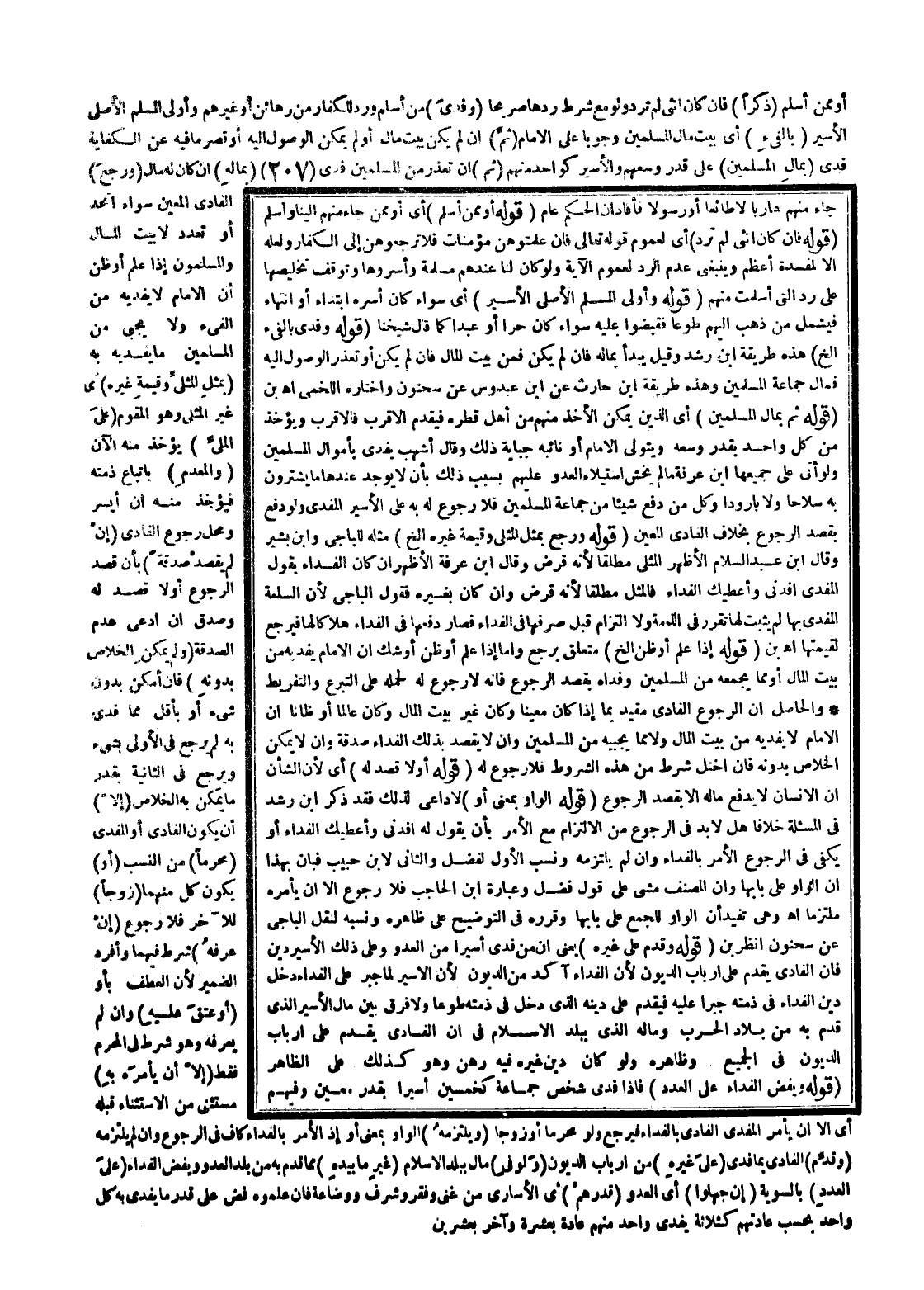 أَوْ مِمَّنْ أَسْلَمَ (ذَكَرًا) فَإِنْ كَانَ أُنْثَى لَمْ تُرَدَّ وَلَوْ مَعَ شَرْطِ رَدِّهَا صَرِيحًا (وَفُدِيَ) مَنْ أَسْلَمَ وَرُدَّ لِلْكُفَّارِ مِنْ رَهَائِن أَوْ غَيْرِهِمْ، وَأَوْلَى الْمُسْلِمُ الْأَصْلِيُّ الْأَسِيرُ (بِالْفَيْءِ) أَيْ بَيْتُ مَالِ الْمُسْلِمِينَ وُجُوبًا عَلَى الْإِمَامِ (ثُمَّ) إنْ لَمْ يَكُنْ بَيْتُ مَالٍ أَوْ لَمْ يُمْكِنُ الْوُصُولُ إلَيْهِ أَوْ قَصَرَ مَا فِيهِ عَنْ الْكِفَايَةِ فُدِيَ (بِمَالِ الْمُسْلِمِينَ) عَلَى قَدْرِ وُسْعِهِمْ وَالْأَسِيرُ كَوَاحِدٍ مِنْهُمْ (ثُمَّ) إنْ تَعَذَّرَ مِنْ الْمُسْلِمِينَ فُدِيَ (بِمَالِهِ) إنْ كَانَ لَهُ مَالٌ (وَرَجَعَ) الْفَادِي الْمُعَيَّنُ سَوَاءٌ اتَّحَدَ أَوْ تَعَدَّدَ عَلَى بَيْتِ مَالِ الْمُسْلِمِينَ إذَا عَلِمَ أَوْ ظَنَّ أَنَّ الْإِمَامَ لَا يَفْدِيهِ مِنْ الْفَيْءِ وَلَا يَجْبِي مِنْ الْمُسْلِمِينَ مَا يَفْدِيهِ بِهِ (بِمِثْلِ الْمِثْلِيِّ وَقِيمَةِ غَيْرِهِ) أَيْ غَيْرِ الْمِثْلِيِّ، وَهُوَ الْمُقَوَّمُ (عَلَى الْمَلِيِّ) يُؤْخَذُ مِنْهُ الْآنَ (وَالْمُعْدِمِ) بِاتِّبَاعِ ذِمَّتِهِ فَيُؤْخَذُ مِنْهُ إنْ أَيْسَرَ، وَمَحَلُّ رُجُوعِ الْفَادِي (إنْ لَمْ يَقْصِدْ صَدَقَةً) بِأَنْ قَصَدَ الرُّجُوعَ أَوْ لَا قَصَدَ لَهُ وَصُدِّقَ إنْ ادَّعَى عَدَمَ الصَّدَقَةِ (وَلَمْ يُمْكِنْ الْخَلَاصُ بِدُونِهِ) فَإِنْ أَمْكَنَ بِدُونِ شَيْءٍ أَوْ بِأَقَلِّ مِمَّا فُدِيَ بِهِ لَمْ يَرْجِعْ فِي الْأُولَى بِشَيْءٍ، وَيَرْجِعُ فِي الثَّانِيَةِ بِقَدْرِ مَا يُمْكِنُ بِهِ الْخَلَاصُ (إلَّا) أَنْ يَكُونَ الْفَادِي أَوْ الْمَفْدِيُّ (مَحْرَمًا) مِنْ النَّسَبِ (أَوْ) يَكُونَ كُلٌّ مِنْهُمَا (زَوْجًا) لِلْآخَرِ فَلَا رُجُوعَ (إنْ عَرَفَهُ) شَرَطَ فِيهِمَا، وَأَفْرَدَ الضَّمِيرَ؛ لِأَنَّ الْعَطْفَ بِأَوْ (أَوْ عَتَقَ عَلَيْهِ) ، وَإِنْ لَمْ يَعْرِفْهُ، وَهُوَ شَرْطٌ فِي الْمَحْرَمِ فَقَطْ (إلَّا أَنْ يَأْمُرَهُ بِهِ) مُسْتَثْنًى مِنْ الِاسْتِثْنَاءِ قَبْلَهُ أَيْ إلَّا أَنْ يَأْمُرَ الْمَفْدِيُّ الْفَادِي بِالْفِدَاءِ فَيَرْجِعُ وَلَوْ مَحْرَمًا أَوْ زَوْجًا (وَيَلْتَزِمُهُ) الْوَاوُ بِمَعْنَى أَوْ إذْ الْأَمْرُ بِالْفِدَاءِ كَافٍ فِي الرُّجُوعِ وَإِنْ لَمْ يَلْتَزِمْهُ (وَقُدِّمَ) الْفَادِي بِمَا فُدِيَ (عَلَى غَيْرِهِ) مِنْ أَرْبَابِ الدُّيُونِ (وَلَوْ فِي) مَالٍ بِبَلَدِ الْإِسْلَامِ (غَيْرِ مَا بِيَدِهِ) مِمَّا قَدِمَ بِهِ مِنْ بَلَدِ الْعَدُوِّ، وَيُفَضُّ الْفِدَاءُ (عَلَى الْعَدَدِ) بِالسَّوِيَّةِ (إنْ جَهِلُوا) أَيْ الْعَدُوُّ (قَدْرَهُمْ) أَيْ الْأُسَارَى مِنْ غِنًى وَفَقْرٍ وَشَرَفٍ وَوَضَاعَةٍ فَإِنْ عَلِمُوهُ فُضَّ عَلَى قَدْرِ مَا يُفْدَى بِهِ كُلُّ وَاحِدٍ بِحَسَبِ عَادَتِهِمْ كَثَلَاثَةٍ يُفْدَى وَاحِدٌ مِنْهُمْ عَادَةً بِعَشَرَةٍ وَآخَرُ بِعِشْرِينَ
