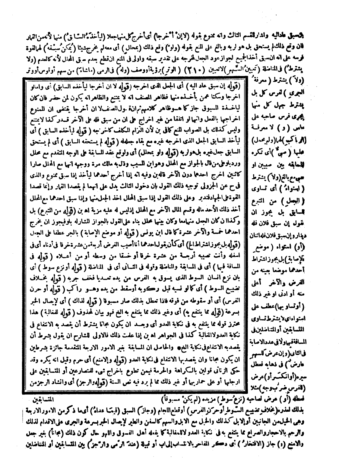 إنْ سَبَقَ عَادَ إلَيْهِ، وَأَشَارَ لِلْقِسْمِ الثَّالِثِ، وَأَنَّهُ مَمْنُوعٌ بِقَوْلِهِ (لَا إنْ أَخْرَجَا) أَيْ أَخْرَجَ كُلٌّ مِنْهُمَا جُعْلًا (لِيَأْخُذَهُ السَّابِقُ) مِنْهُمَا؛ لِأَنَّهُ مِنْ الْقِمَارِ فَإِنْ وَقَعَ ذَلِكَ لَمْ يَسْتَحِقَّ بَلْ هُوَ لِرَبِّهِ وَبَالَغَ عَلَى الْمَنْعِ بِقَوْلِهِ (وَلَوْ) ، وَقَعَ ذَلِكَ (بِمُحَلَّلٍ) أَيْ مَعَهُ يَخْرُجُ شَيْئًا (يُمْكِنُ سَبْقُهُ) لَهُمَا لِقُوَّةِ فَرَسِهِ عَلَى أَنَّهُ إنْ سَبَقَ أَخَذَ الْجَمِيعَ لِجَوَازِ عَوْدِ الْجُعْلِ لِمُخْرِجِهِ عَلَى تَقْدِيرِ سَبْقِهِ، وَأَوْلَى فِي الْمَنْعِ إنْ قَطَعَ بِعَدَمِ سَبْقِ الْمُحَلِّلِ؛ لِأَنَّهُ كَالْعَدَمِ (وَلَا يُشْتَرَطُ) فِي الْمُنَاضَلَةِ (تَعْيِينُ السَّهْمِ) لَا تَعْيِينُ (الْوَتَرِ) بِرُؤْيَةٍ أَوْ وَصْفٍ (وَلَهُ) فِي الرَّمْيِ (مَا شَاءَ) مِنْ سَهْمٍ أَوْ قَوْسٍ أَوْ وَتَرٍ (وَلَا) يُشْتَرَطُ (مَعْرِفَةُ الْجَرْيِ) لِفَرَسِ كُلٍّ بَلْ يُشْتَرَطُ جَهْلُ كُلٍّ مِنْهُمَا بِجَرْيِ فَرَسَ صَاحِبِهِ عَلَى مَا مَرَّ (وَ) لَا مَعْرِفَةُ (الرَّاكِبِ) لَهُمَا (وَلَمْ يُحْمَلْ) عَلَيْهَا (صَبِيٌّ) أَيْ تُكْرَهُ الْمُسَابَقَةُ بَيْنَ صَبِيَّيْنِ أَوْ صَبِيٍّ مَعَ بَالِغٍ (وَلَا) يُشْتَرَطُ (اسْتِوَاءُ) أَيْ تَسَاوِي (الْجُعْلِ) مِنْ الْمُتَبَرِّعِ لِلسَّابِقِ بَلْ يَجُوزُ أَنْ يَقُولَ إنْ سَبَقَ فُلَانٌ فَلَهُ دِينَارٌ، وَإِنْ سَبَقَ فُلَانٌ فَلَهُ اثْنَانِ (أَوْ) اسْتِوَاءُ (مَوْضِعِ الْإِصَابَةِ) بَلْ يَجُوزُ اشْتِرَاطُ أَحَدِهِمَا مَوْضِعًا بِعَيْنِهِ مِنْ الْغَرَضِ وَالْآخَرُ أَعْلَى مِنْهُ أَوْ أَدْنَى أَوْ غَيْرِ ذَلِكَ (أَوْ تَسَاوِيهِمَا) عَطْفٌ عَلَى اسْتِوَاءٍ أَيْ لَا يُشْتَرَطُ تَسَاوِي الْمُتَسَابِقَيْنِ أَوْ الْمُتَنَاضَلَيْنِ فِي الْمَسَافَةِ فِيهِمَا وَلَا فِي عَدَدِ الْإِصَابَةِ فِي الثَّانِي (وَإِنْ) (عَرَضَ لِلسَّهْمِ عَارِضٌ) فِي ذَهَابِهِ فَعَطَّلَ سَيْرَهُ (أَوْ انْكَسَرَ) (أَوْ) عَرَضَ (لِلْفَرَسِ ضَرْبُ وَجْهِ) مَثَلًا فَعَطَّلَهُ (أَوْ) عَرَضَ لِصَاحِبِهِ (نَزْعُ سَوْطٍ) مِنْ يَدِهِ (لَمْ يَكُنْ مَسْبُوقًا) بِذَلِكَ لِعُذْرِهِ (بِخِلَافِ تَضْيِيعِ السَّوْطِ أَوْ حَرَنِ الْفَرَسِ) أَوْ قَطْعِ اللِّجَامِ (وَجَازَ) السَّبْقُ (فِيمَا عَدَاهُ) أَيْ مَا ذُكِرَ مِنْ الْأُمُورِ الثَّلَاثَةِ، وَهِيَ الْخَيْلُ مِنْ الْجَانِبَيْنِ أَوْ الْإِبِلُ كَذَلِكَ وَالْخَيْلُ مَعَ الْإِبِلِ كَالسُّفُنِ وَالطَّيْرِ لِإِيصَالِ الْخَبَرِ بِسُرْعَةٍ وَالْجَرْيُ عَلَى الْأَقْدَامِ لِذَلِكَ وَالرَّجْمُ بِالْأَحْجَارِ وَالصِّرَاعُ مِمَّا يَنْتَفِعُ بِهِ فِي نِكَايَةِ الْعَدُوِّ لَا لِلْمُغَالَبَةِ كَمَا يَفْعَلُهُ أَهْلُ الْفُسُوقِ وَاللَّهْوِ حَالَ كَوْنِ ذَلِكَ (مَجَّانًا) بِغَيْرِ جُعْلٍ، وَإِلَّا مُنِعَ.