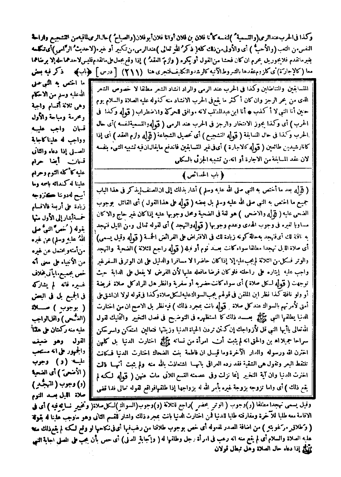 دَرْسٌ (بَابُ الْخَصَائِصِ) ذُكِرَ فِيهِ بَعْضُ مَا اخْتَصَّ بِهِ النَّبِيُّ - صَلَّى اللَّهُ عَلَيْهِ وَسَلَّمَ - مِنْ الْأَحْكَامِ وَهِيَ ثَلَاثَةُ أَقْسَامٍ: وَاجِبَةٌ وَمُحَرَّمَةٌ وَمُبَاحَةٌ وَالْأَوَّلُ قِسْمَانِ وَاجِبٌ عَلَيْهِ وَوَاجِبٌ لَهُ عَلَيْنَا كَإِجَابَةِ الْمُصَلِّي إذَا دَعَاهُ. وَالثَّانِي قِسْمَانِ أَيْضًا حَرَامٌ عَلَيْهِ كَأَكْلِهِ الثُّومَ وَحَرَامٌ عَلَيْنَا لَهُ كَنِدَائِهِ بِاسْمِهِ وَمَا أُبِيحَ لَهُ دُونَنَا كَتَزَوُّجِهِ زِيَادَةً عَلَى أَرْبَعَةٍ، فَالْأَقْسَامُ خَمْسَةٌ أَشَارَ إلَى الْأَوَّلِ مِنْهَا بِقَوْلِهِ (خُصَّ النَّبِيُّ - صَلَّى اللَّهُ عَلَيْهِ وَسَلَّمَ -) عَنْ غَيْرِهِ مِنْ أُمَّتِهِ وَيُحْتَمَلُ عَنْ غَيْرِهِ مِنْ الْأَنْبِيَاءِ عَلَى مَعْنَى أَنَّهُ خُصَّ بِجَمِيعِ مَا يَأْتِي بِخِلَافِ غَيْرِهِ فَإِنَّهُ لَمْ يُشَارِكْهُ فِي الْجَمِيعِ بَلْ فِي الْبَعْضِ (بِوُجُوبِ) صَلَاةِ (الضُّحَى) وَأَقَلُّ الْوَاجِبِ عَلَيْهِ مِنْهُ رَكْعَتَانِ عَلَى هَذَا الْقَوْلِ وَهُوَ ضَعِيفٌ وَالْجُمْهُورُ عَلَى أَنَّهُ مُسْتَحَبٌّ عَلَيْهِ.