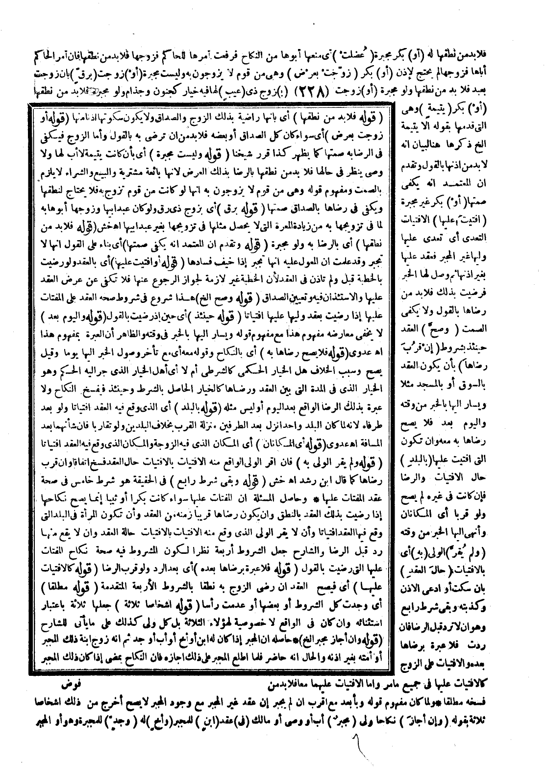وَحَاصِلُ الْمَسْأَلَةِ أَنَّ الْمُفْتَاتَ عَلَيْهَا سَوَاءٌ كَانَتْ بِكْرًا أَوْ ثَيِّبًا إنَّمَا يَصِحُّ نِكَاحُهَا إذَا رَضِيَتْ بِذَلِكَ الْعَقْدِ بِالنُّطْقِ وَأَنْ يَكُونَ رِضَاهَا قَرِيبًا زَمَنُهُ مِنْ الْعَقْدِ وَأَنْ تَكُونَ الْمَرْأَةُ فِي الْبَلَدِ الَّتِي وَقَعَ فِيهَا الْعَقْدُ افْتِيَاتًا وَأَنْ لَا يُقِرَّ الْوَلِيُّ الَّذِي وَقَعَ مِنْهُ الِافْتِيَاتُ بِالِافْتِيَاتِ حَالَةَ الْعَقْدِ وَأَنْ لَا يَقَعَ مِنْهَا رَدٌّ قَبْلَ الرِّضَا. وَالشَّارِحُ جَعَلَ الشُّرُوطَ أَرْبَعَةً نَظَرًا لِكَوْنِ الْمَشْرُوطِ فِيهِ صِحَّةَ نِكَاحِ الْمُفْتَاتِ عَلَيْهَا الَّتِي رَضِيَتْ بِالْقَوْلِ.