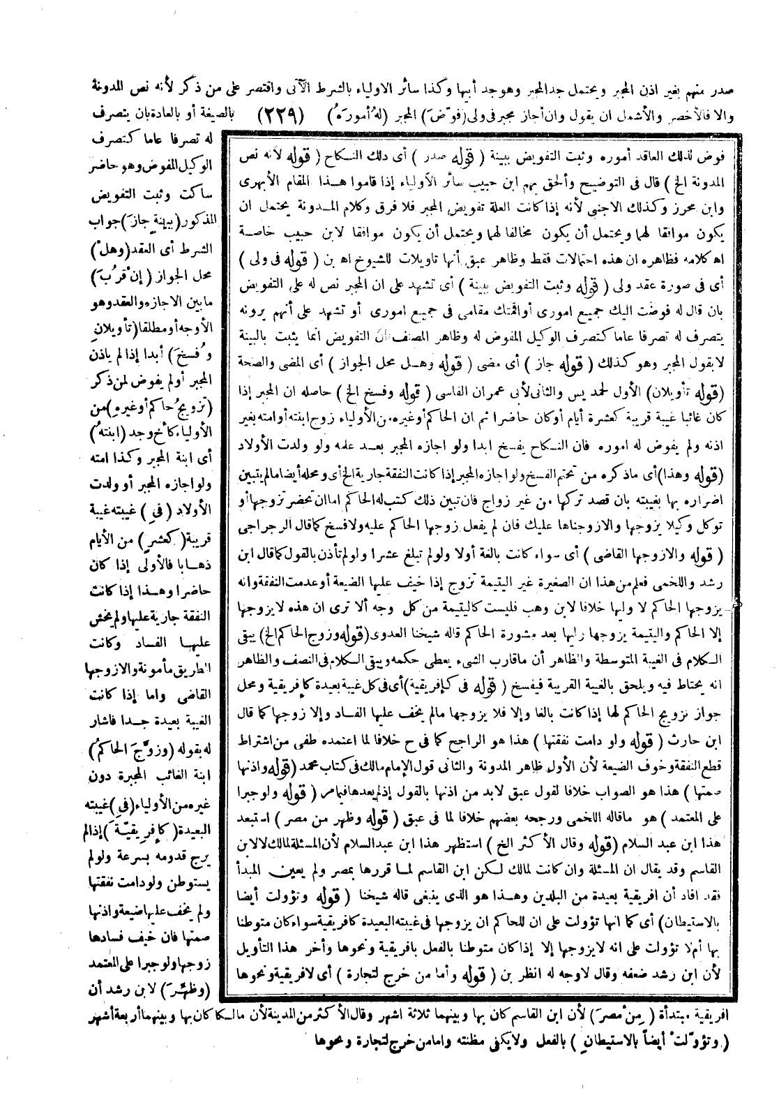 صَدَرَ مِنْهُمْ بِغَيْرِ إذْنِ الْمُجْبِرِ وَيُحْتَمَلُ جَدُّ الْمُجْبِرِ وَهُوَ جَدُّ أَبِيهَا، وَكَذَا سَائِرُ الْأَوْلِيَاءِ بِالشَّرْطِ الْآتِي وَاقْتُصِرَ عَلَى مَنْ ذُكِرَ؛ لِأَنَّهُ نَصُّ الْمُدَوَّنَةِ وَإِلَّا فَالْأَخْصَرُ وَالْأَشْمَلُ أَنْ يَقُولَ، وَإِنْ أَجَازَ مُجْبِرٌ فِي وَلِيٍّ (فَوَّضَ) الْمُجْبِرُ (لَهُ أُمُورَهُ) بِالصِّيغَةِ أَوْ بِالْعَادَةِ بِأَنْ يَتَصَرَّفَ لَهُ تَصَرُّفًا عَامًّا كَتَصَرُّفِ الْوَكِيلِ الْمُفَوَّضِ وَهُوَ حَاضِرٌ سَاكِتٌ وَثَبَتَ التَّفْوِيضُ الْمَذْكُورُ (بِبَيِّنَةٍ جَازَ) جَوَابُ الشَّرْطِ أَيْ الْعَقْدُ (وَهَلْ) مَحَلُّ الْجَوَازِ (إنْ قَرُبَ) مَا بَيْنَ الْإِجَازَةِ وَالْعَقْدِ وَهُوَ الْأَوْجَهُ أَوْ مُطْلَقًا (تَأْوِيلَانِ وَفُسِخَ) أَبَدًا إذَا لَمْ يَأْذَنْ الْمُجْبِرُ أَوْ لَمْ يُفَوِّضْ لِمَنْ ذُكِرَ (تَزْوِيجُ حَاكِمٍ أَوْ غَيْرِهِ) مِنْ الْأَوْلِيَاءِ كَأَخٍ وَجَدٍّ (ابْنَتَهُ) أَيْ ابْنَةَ الْمُجْبِرِ، وَكَذَا أَمَتُهُ، وَلَوْ أَجَازَهُ الْمُجْبِرُ أَوْ وَلَدَتْ الْأَوْلَادَ (فِي) غَيْبَتِهِ غَيْبَةً قَرِيبَةً (كَعَشْرٍ) مِنْ الْأَيَّامِ ذَهَابًا فَالْأَوْلَى إذَا كَانَ حَاضِرًا وَهَذَا إذَا كَانَتْ النَّفَقَةُ جَارِيَةً عَلَيْهَا وَلَمْ يَخْشَ عَلَيْهَا الْفَسَادَ وَكَانَتْ الطَّرِيقُ مَأْمُونَةً وَإِلَّا زَوَّجَهَا الْقَاضِي.