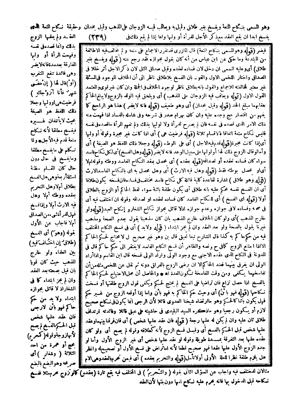 وَلَمَّا تَكَلَّمَ عَلَى مَا يُفْسَخُ مُطْلَقًا وَمَا يُفْسَخُ فِي حَالٍ دُونَ حَالٍ كَانَ الْمَقَامُ مَظِنَّةَ أَسْئِلَةٍ أَرْبَعَةٍ وَهِيَ هَلْ الْفَسْخُ بِطَلَاقٍ أَمْ لَا وَهَلْ التَّحْرِيمُ بِعَقْدِهِ وَوَطْئِهِ أَمْ لَا وَهَلْ فِيهِ الْإِرْثُ أَمْ لَا وَإِذَا فُسِخَ فَهَلْ لِلْمَرْأَةِ شَيْءٌ مِنْ الصَّدَاقِ أَمْ لَا فَأَجَابَ عَنْ الْأَوَّلِ بِقَوْلِهِ (وَهُوَ) أَيْ الْفَسْخُ (طَلَاقٌ إنْ اُخْتُلِفَ فِيهِ) بَيْنَ الْعُلَمَاءِ، وَلَوْ خَارِجَ الْمَذْهَبِ حَيْثُ كَانَ قَوِيًّا بِأَنْ قِيلَ بِصِحَّتِهِ بَعْدَ الْعَقْدِ، وَإِنْ لَمْ يَجُزْ ابْتِدَاءً كَمَا فِي الشِّغَارِ، إذْ لَا قَائِلَ بِجَوَازِهِ ابْتِدَاءً وَلَا بُدَّ مِنْ حُكْمِ حَاكِمٍ فَهُوَ بَائِنٌ لَا رَجْعِيٌّ فَإِنْ عَقَدَ عَلَيْهَا شَخْصٌ قَبْلَ الْحُكْمِ بِالْفَسْخِ لَمْ يَصِحَّ؛ لِأَنَّهَا زَوْجَةٌ وَقَوْلُهُ: (كَمُحْرِمٍ) بِحَجٍّ أَوْ عُمْرَةٍ مِنْ أَحَدِ الثَّلَاثَةِ (وَشِغَارٍ) أَيْ صَرِيحِهِ وَهُوَ الْبُضْعُ بِالْبُضْعِ مِثَالَانِ لِلْمُخْتَلَفِ فِيهِ.