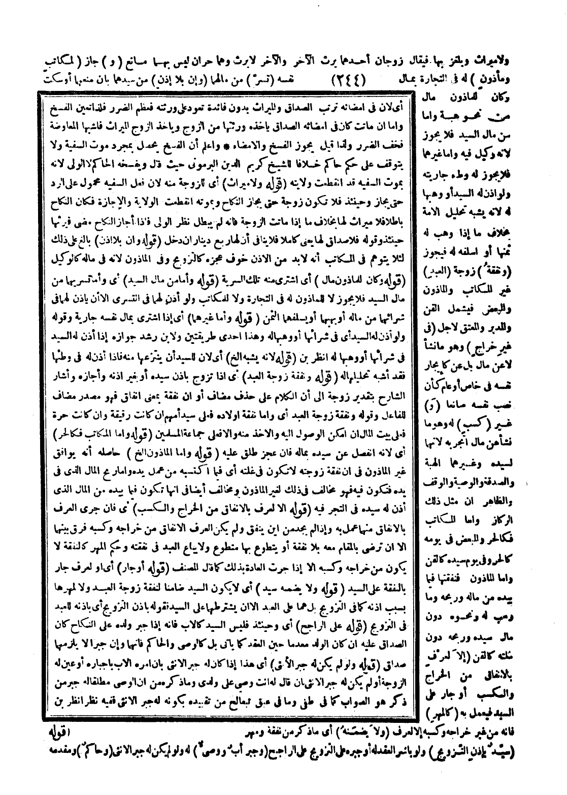 (قَوْلُهُ: وَأَمَّا الْمَأْذُونُ إلَخْ) حَاصِلُهُ أَنَّهُ يُوَافِقُ غَيْرَ الْمَأْذُونِ فِي أَنَّ نَفَقَةَ زَوْجَتِهِ لَا تَكُونُ فِي غَلَّتِهِ أَيْ فِيمَا اكْتَسَبَهُ مِنْ عَمَلِ يَدِهِ، وَأَمَّا رِبْحُ الْمَالِ الَّذِي فِي يَدِهِ فَتَكُونُ فِيهِ فَهُوَ مُخَالِفٌ فِي ذَلِكَ لِغَيْرِ الْمَأْذُونِ وَمُخَالِفٌ أَيْضًا فِي أَنَّهَا تَكُونُ فِيمَا بِيَدِهِ مِنْ الْمَالِ الَّذِي أَذِنَ لَهُ سَيِّدُهُ فِي التَّجْرِ فِيهِ.