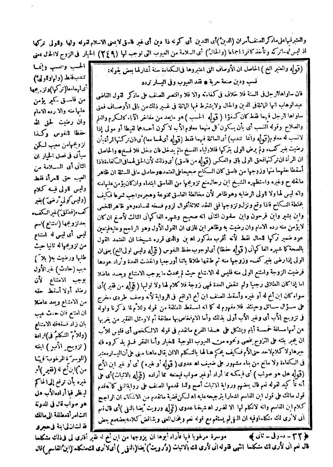 وَالْمُعْتَبَرُ فِيهَا عَلَى مَا ذَكَرَ الْمُصَنِّفُ أَمْرَانِ (الدِّينُ) أَيْ التَّدَيُّنُ أَيْ كَوْنُهُ ذَا دِينٍ أَيْ غَيْرَ فَاسِقٍ لَا بِمَعْنَى الْإِسْلَامِ لِقَوْلِهِ وَلَهَا وَلِلْوَلِيِّ تَرْكُهَا، إذْ لَيْسَ لَهُمَا تَرْكُهُ وَتَأْخُذُ كَافِرًا إجْمَاعًا (وَالْحَالُ) أَيْ السَّلَامَةُ مِنْ الْعُيُوبِ الَّتِي تُوجِبُ لَهَا الْخِيَارَ فِي الزَّوْجِ لَا الْحَالُ بِمَعْنَى الْحَسَبِ وَالنَّسَبِ وَإِنَّمَا تُنْدَبُ فَقَطْ (وَلَهَا وَلِلْوَلِيِّ) أَيْ لَهُمَا مَعًا (تَرْكُهَا) وَتَزْوِيجُهَا مِنْ فَاسِقٍ سِكِّيرٍ يُؤْمَنُ عَلَيْهَا مِنْهُ وَإِلَّا رَدَّهُ الْإِمَامُ، وَإِنْ رَضِيَتْ لِحَقِّ اللَّهِ حِفْظًا لِلنُّفُوسِ، وَكَذَا تَزْوِيجُهَا مِنْ مَعِيبٍ لَكِنْ سَيَأْتِي فِي فَصْلِ الْخِيَارِ أَنَّ الثَّانِيَ أَيْ السَّلَامَةَ مِنْ الْعَيْبِ حَقٌّ لِلْمَرْأَةِ فَقَطْ وَلَيْسَ لِلْوَلِيِّ فِيهِ كَلَامٌ.