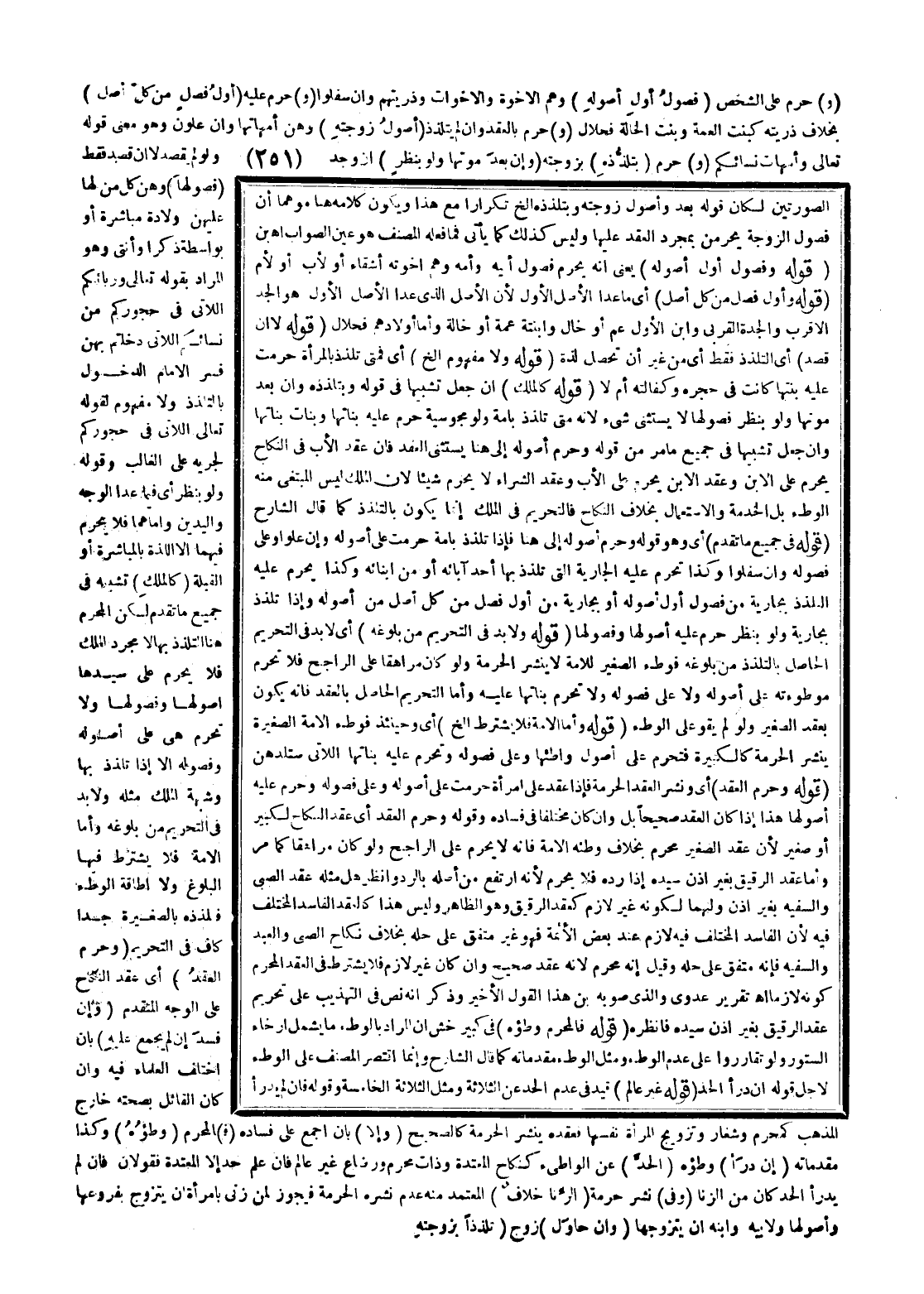 (وَ) حَرُمَ عَلَى الشَّخْصِ (فُصُولُ أَوَّلِ أُصُولِهِ) وَهُمْ الْإِخْوَةُ وَالْأَخَوَاتُ وَذُرِّيَّتُهُمْ، وَإِنْ سَفَلُوا (وَ) حَرُمَ عَلَيْهِ (أَوَّلُ فَصْلٍ مِنْ كُلِّ أَصْلٍ) بِخِلَافِ ذُرِّيَّتِهِ كَبِنْتِ الْعَمَّةِ وَبِنْتِ الْخَالَةِ فَحَلَالٌ (وَ) حَرُمَ بِالْعَقْدِ، وَإِنْ لَمْ يَتَلَذَّذْ (أُصُولُ زَوْجَتِهِ) وَهُنَّ أُمَّهَاتُهَا، وَإِنْ عَلَوْنَ وَهُوَ مَعْنَى قَوْله تَعَالَى {وَأُمَّهَاتُ نِسَائِكُمْ} [النساء: 23] (وَ) حَرُمَ (بِتَلَذُّذِهِ) بِزَوْجَتِهِ (وَإِنْ بَعْدَ مَوْتِهَا، وَلَوْ بِنَظَرٍ) إنْ وُجِدَ، وَلَوْ لَمْ يَقْصِدْ لَا إنْ قَصَدَ فَقَطْ (فُصُولَهَا) وَهُنَّ كُلُّ مَنْ لَهَا عَلَيْهِنَّ وِلَادَةٌ مُبَاشِرَةٌ أَوْ بِوَاسِطَةٍ ذَكَرًا وَأُنْثَى، وَهُوَ الْمُرَادُ بِقَوْلِهِ تَعَالَى {وَرَبَائِبُكُمُ اللاتِي فِي حُجُورِكُمْ مِنْ نِسَائِكُمُ اللاتِي دَخَلْتُمْ بِهِنَّ} [النساء: 23] فَسَّرَ الْإِمَامُ الدُّخُولَ بِالتَّلَذُّذِ وَلَا مَفْهُومَ لِقَوْلِهِ تَعَالَى {اللاتِي فِي حُجُورِكُمْ} [النساء: 23] لِجَرْيِهِ عَلَى الْغَالِبِ وَقَوْلُهُ: وَلَوْ بِنَظَرٍ أَيْ فِيمَا عَدَا الْوَجْهِ وَالْيَدَيْنِ، وَأَمَّا هُمَا فَلَا يَحْرُمُ فِيهِمَا إلَّا اللَّذَّةُ بِالْمُبَاشَرَةِ أَوْ الْقُبْلَةِ (كَالْمِلْكِ) تَشْبِيهٌ فِي جَمِيعِ مَا تَقَدَّمَ لَكِنَّ الْمُحَرَّمَ هُنَا التَّلَذُّذُ بِهَا لَا مُجَرَّدُ الْمِلْكِ فَلَا يَحْرُمُ عَلَى سَيِّدِهَا أُصُولُهَا وَفُصُولُهَا وَلَا تَحْرُمُ هِيَ عَلَى أُصُولِهِ وَفُصُولِهِ إلَّا إذَا تَلَذَّذَ بِهَا وَشُبْهَةُ الْمِلْكِ مِثْلُهُ وَلَا بُدَّ فِي التَّحْرِيمِ مِنْ بُلُوغِهِ، وَأَمَّا الْأَمَةُ فَلَا يُشْتَرَطُ فِيهَا الْبُلُوغُ وَلَا إطَاقَةُ الْوَطْءِ فَتَلَذُّذُهُ بِالصَّغِيرَةِ جِدًّا كَافٍ فِي التَّحْرِيمِ (وَحُرِّمَ الْعَقْدُ) أَيْ عَقْدُ النِّكَاحِ عَلَى الْوَجْهِ الْمُتَقَدِّمِ (وَإِنْ فَسَدَ إنْ لَمْ يُجْمَعْ عَلَيْهِ) بِأَنْ اخْتَلَفَ الْعُلَمَاءُ فِيهِ، وَإِنْ كَانَ الْقَائِلُ بِصِحَّتِهِ خَارِجَ الْمَذْهَبِ كَمُحْرِمٍ وَشِغَارٍ وَتَزْوِيجِ الْمَرْأَةِ نَفْسَهَا فَعَقْدُهُ يَنْشُرُ الْحُرْمَةَ كَالصَّحِيحِ (وَإِلَّا) بِأَنْ أُجْمِعَ عَلَى فَسَادِهِ (فَ) الْمُحَرَّمُ (وَطْؤُهُ) ، وَكَذَا مُقَدِّمَاتُهُ (إنْ دَرَأَ) وَطْؤُهُ (الْحَدَّ) عَنْ الْوَاطِئِ كَنِكَاحِ الْمُعْتَدَّةِ وَذَاتِ مَحْرَمٍ وَرَضَاعٍ غَيْرَ عَالِمٍ فَإِنْ عَلِمَ حُدَّ إلَّا الْمُعْتَدَّةُ فَقَوْلَانِ فَإِنْ لَمْ يَدْرَأْ الْحَدَّ كَانَ مِنْ الزِّنَا.