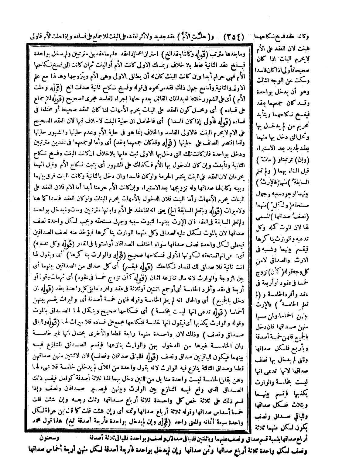 وَشُبِّهَ فِي الْإِرْثِ وَالصَّدَاقِ لَا مِنْ كُلِّ وَجْهٍ قَوْلُهُ: (كَأَنْ) تَزَوَّجَ خَمْسًا فِي عُقُودٍ أَوْ أَرْبَعَةً فِي عَقْدٍ وَأَفْرَدَ الْخَامِسَةَ وَ (لَمْ تُعْلَمْ الْخَامِسَةُ) فَالْإِرْثُ بَيْنَهُنَّ أَخْمَاسًا وَلِمَنْ مَسَّهَا مِنْهُنَّ صَدَاقُهَا فَإِنْ دَخَلَ بِالْجَمِيعِ فَلَهُنَّ خَمْسَةُ أَصْدِقَةٍ وَبِأَرْبَعٍ فَلِكُلٍّ صَدَاقُهَا وَلَلَّتِي لَمْ يَدْخُلْ بِهَا نِصْفُ صَدَاقِهَا؛ لِأَنَّهَا تَدَّعِي أَنَّهَا لَيْسَتْ بِخَامِسَةٍ وَالْوَارِثُ يُكَذِّبُهَا فَيُقْسَمُ بَيْنَهُمَا وَبِثَلَاثٍ فَلِكُلٍّ صَدَاقُهَا وَلِلْبَاقِي صَدَاقٌ وَنِصْفٌ يَكُونُ لِكُلٍّ مِنْهُمَا ثَلَاثَةُ أَرْبَاعِ صَدَاقِهَا بِنِسْبَةِ قَسْمِ صَدَاقٍ وَنِصْفٍ عَلَيْهِمَا وَبِاثْنَتَيْنِ، فَلِلْبَاقِي صَدَاقَانِ وَنِصْفٌ وَبِوَاحِدَةٍ فَلِلْبَاقِي ثَلَاثَةُ أَصْدِقَةٍ وَنِصْفٌ لِكُلِّ وَاحِدَةٍ ثَلَاثَةُ أَرْبَاعِ صَدَاقِهَا وَثُمُنُ صَدَاقِهَا، وَإِنْ لَمْ يَدْخُلْ بِوَاحِدَةٍ فَأَرْبَعَةُ أَصْدِقَةٍ لِكُلٍّ مِنْهُنَّ أَرْبَعَةُ أَخْمَاسِ صَدَاقِهَا.