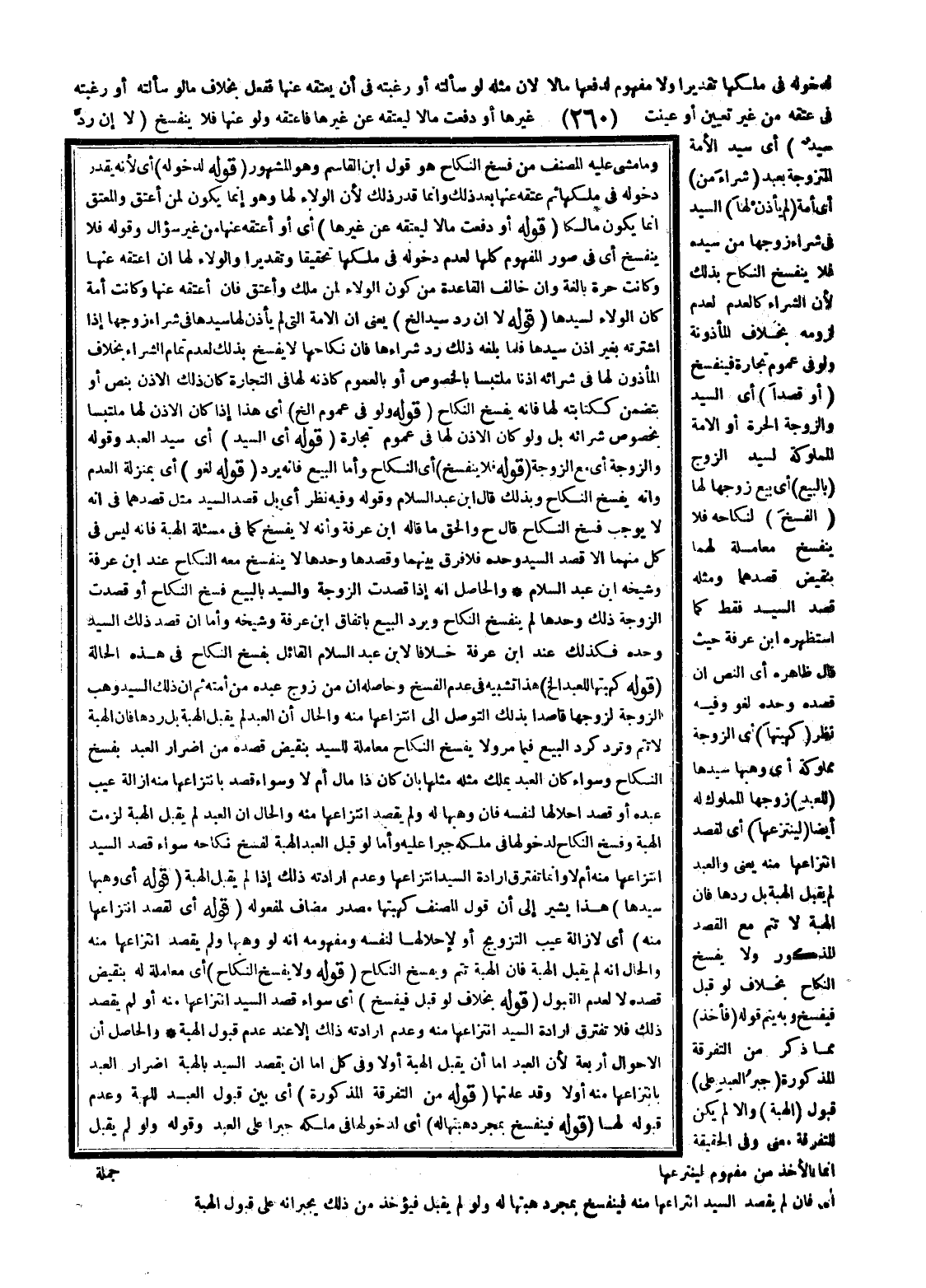 وَالْحَاصِلُ أَنَّهُ إذَا قَصَدَتْ الزَّوْجَةُ وَالسَّيِّدُ بِالْبَيْعِ فَسْخَ النِّكَاحِ أَوْ قَصَدَتْ الزَّوْجَةُ ذَلِكَ وَحْدَهَا لَمْ يَنْفَسِخْ النِّكَاحُ وَيُرَدَّ الْبَيْعُ بِاتِّفَاقِ ابْنِ عَرَفَةَ وَشَيْخِهِ، وَأَمَّا إنْ قَصَدَ ذَلِكَ السَّيِّدَ وَحْدَهُ فَكَذَلِكَ عِنْدَ ابْنِ عَرَفَةَ خِلَافًا لِابْنِ عَبْدِ السَّلَامِ الْقَائِلِ بِفَسْخِ النِّكَاحِ فِي هَذِهِ الْحَالَةِ.