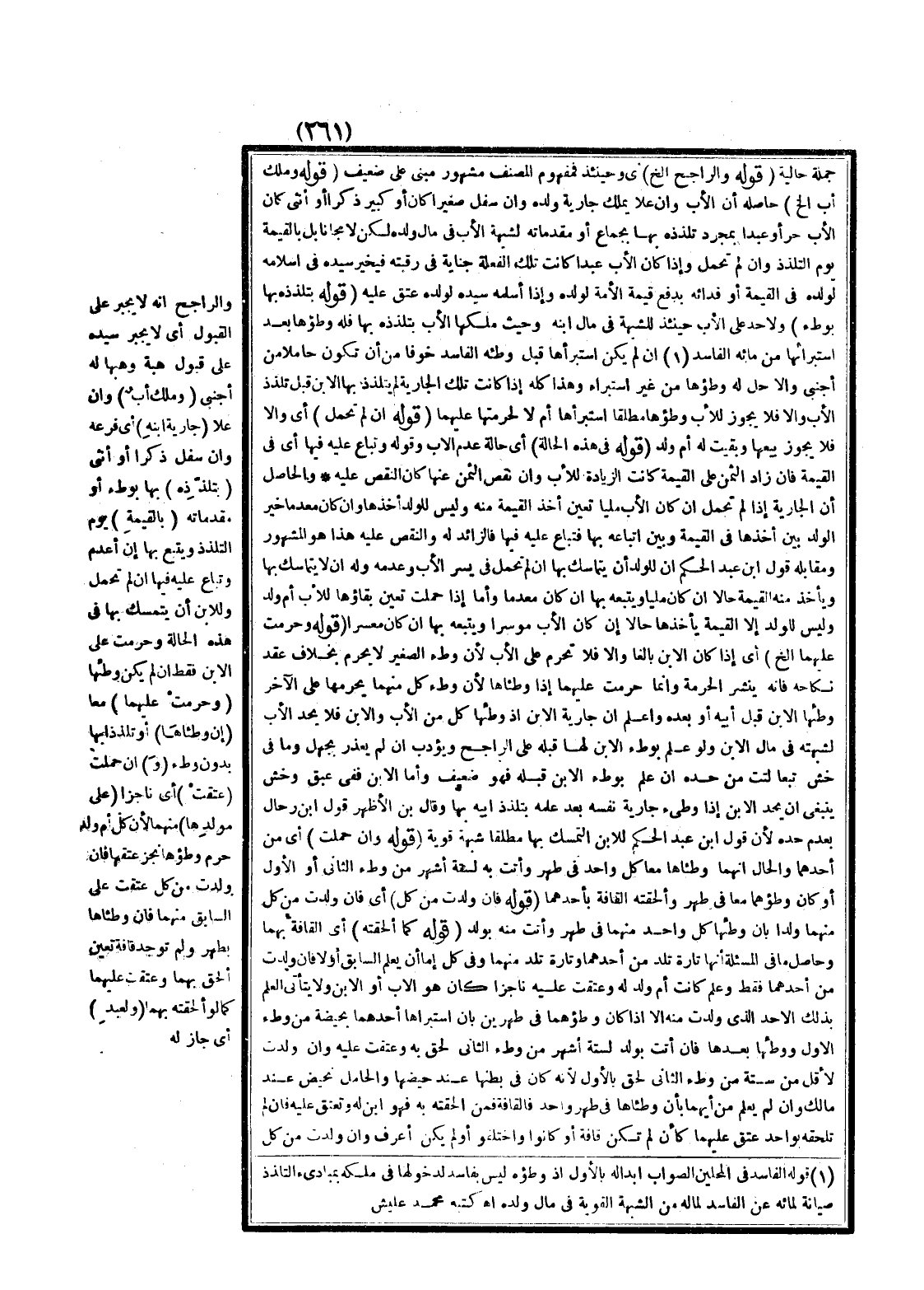 (قَوْلُهُ: وَمَلَكَ أَبٌ إلَخْ) حَاصِلُهُ أَنَّ الْأَبَ، وَإِنْ عَلَا يَمْلِكُ جَارِيَةَ وَلَدِهِ، وَإِنْ سَفَلَ صَغِيرًا كَانَ أَوْ كَبِير ذَكَرًا أَوْ أُنْثَى كَانَ الْأَبُ حُرّ أَوْ عَبْدًا بِمُجَرَّدِ تَلَذُّذِهِ بِهَا بِجِمَاعٍ أَوْ مُقَدِّمَاتِهِ لِشُبْهَةِ الْأَبِ فِي مَالِ وَلَدِهِ لَكِنْ لَا مَجَّانًا بَلْ بِالْقِيمَةِ يَوْمَ التَّلَذُّذِ، وَإِنْ لَمْ تَحْمِلْ وَإِذَا كَانَ الْأَبُ عَبْدًا كَانَتْ تِلْكَ الْفَعْلَةُ جِنَايَةً فِي رَقَبَتِهِ فَيُخَيَّرُ سَيِّدُهُ فِي إسْلَامِهِ لِوَلَدِهِ فِي الْقِيمَةِ أَوْ فِدَائِهِ بِدَفْعِ قِيمَةِ الْأَمَةِ لِوَلَدِهِ وَإِذَا أَسْلَمَهُ سَيِّدُهُ لِوَلَدِهِ عَتَقَ عَلَيْهِ.