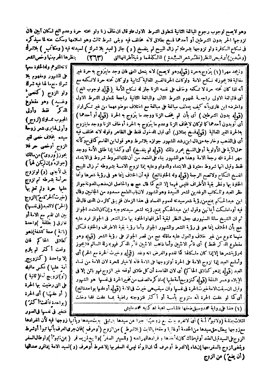 وَهُوَ لَا يَصِحُّ لِوُجُوبِ رُجُوعِ الْمُبَالَغَةِ الثَّانِيَةِ لِمَنْطُوقِ الشَّرْطِ الْأَوَّلِ فَلَوْ قَالَ إنْ خَافَ زِنًا، وَلَوْ تَحْتَهُ حُرَّةً وَعُدِمَ إلَخْ لَكَانَ أَبْيَنَ فَإِنْ تَزَوَّجَهَا الْحُرُّ بِدُونِ الشَّرْطَيْنِ أَوْ أَحَدِهِمَا فُسِخَ بِطَلَاقٍ؛ لِأَنَّهُ مُخْتَلَفٌ فِيهِ، وَبَقِيَ شَرْطٌ ثَالِثٌ وَهُوَ إسْلَامُهَا وَسَكَتَ عَنْهُ لِمَا سَيَذْكُرُهُ فِي نِكَاحِ الْكَافِرَةِ، وَلَوْ تَزَوَّجَهَا بِشَرْطِهِ، ثُمَّ زَالَ الْمُبِيحُ لَمْ يَنْفَسِخْ.
